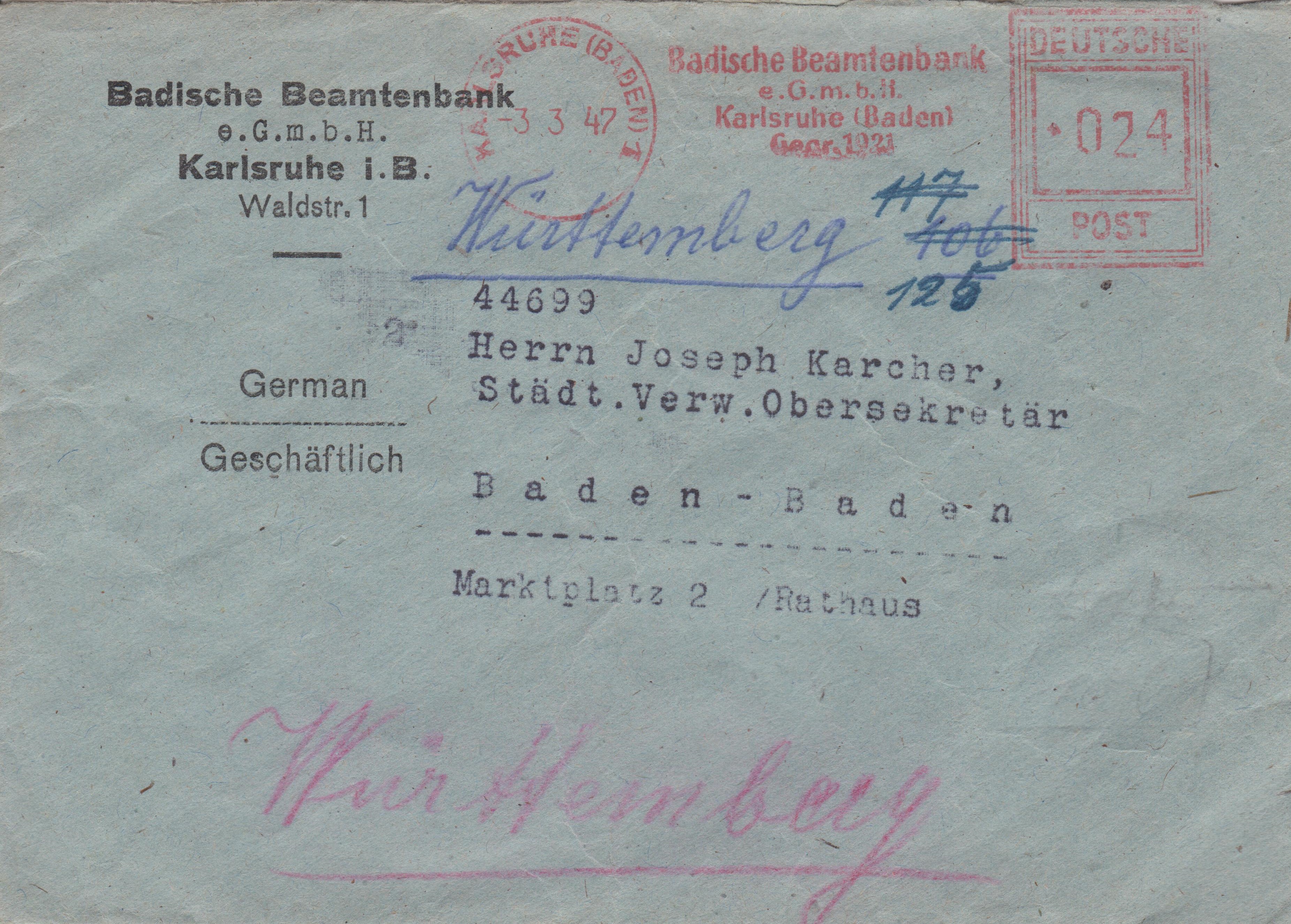 Dieser Brief vom 03.03.1947 zeigt einen Absenderfreistempel