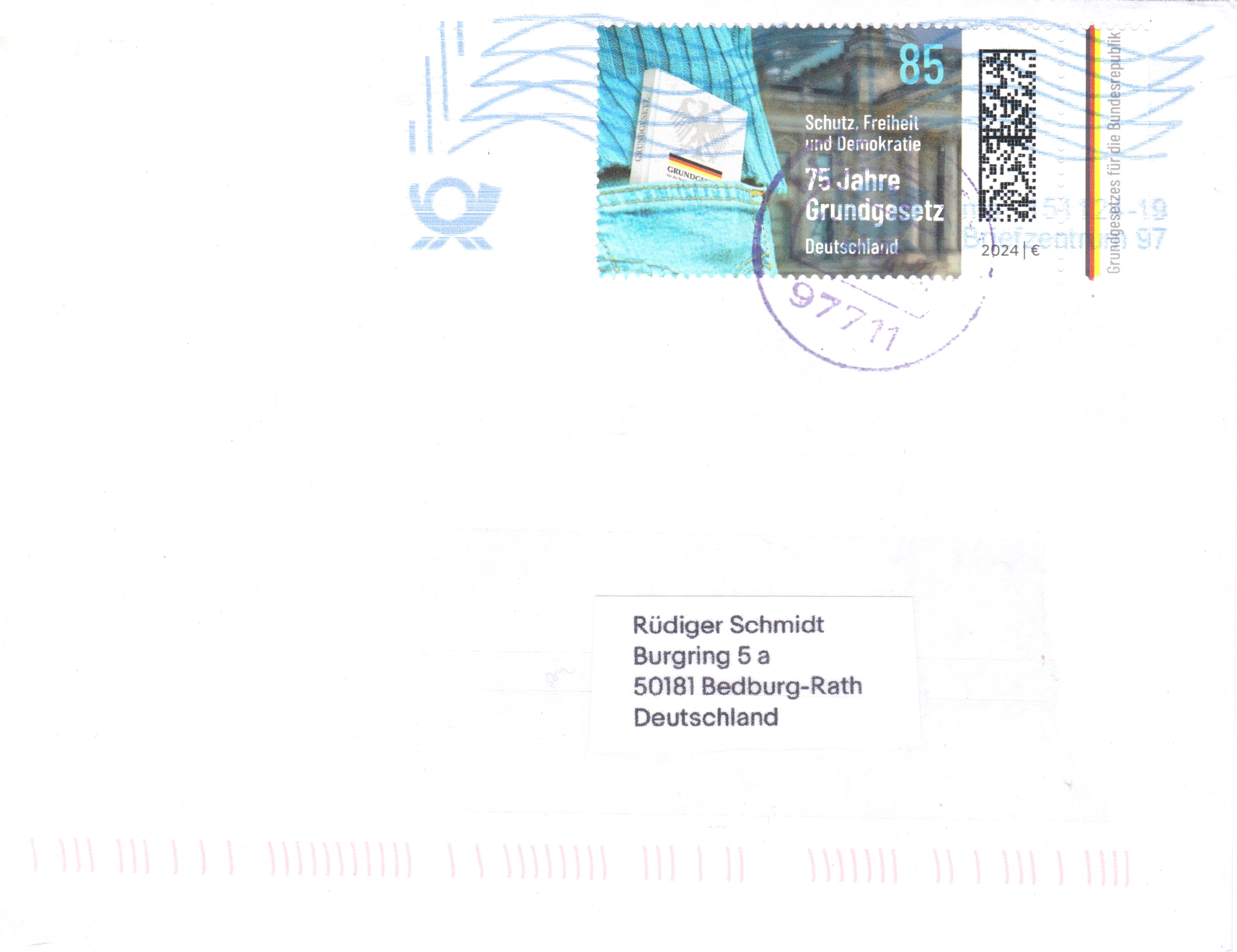 Deutschland MiNr 3830 erschien zum Jubiläum "75 Jahre Grundgesetz", hier als Einzelfrankatur auf einem Bedarfsbrief aus meiner Tagespost:
