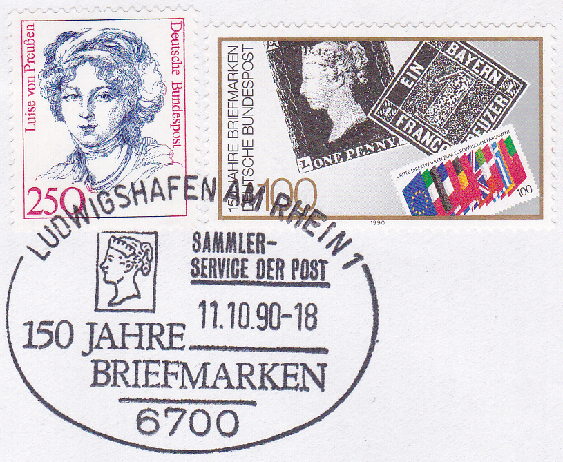 Hier zeige ich einen Brief per Einschreiben mit der Marke "150 Jahre Briefmarken" (MiNr 1479) und einer Marke zu 250 Pf aus der Serie "Bedeutende Frauen" mit dem Sonderstempel aus Ludwigshafen am Rhein.