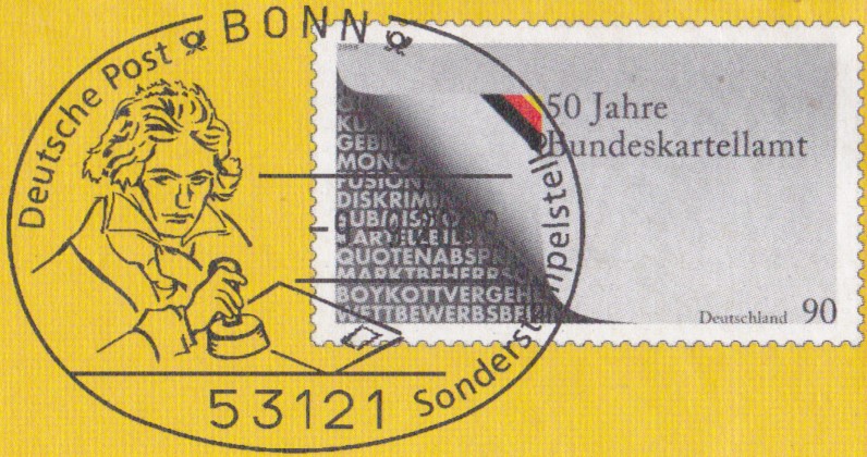 Dieser Ganzsachenumschlag (MiNr EA F449; eine Eigenausgaben der DP AG - Philatelie Weiden) im Format 229x114 mm hat einen Wertstempel mit der 90 Cent-Marke "50 Jahre Bundeskartellamt" (MiNr 2641). Die Vorausentwertung trägt das Datum "-9.-9.09".