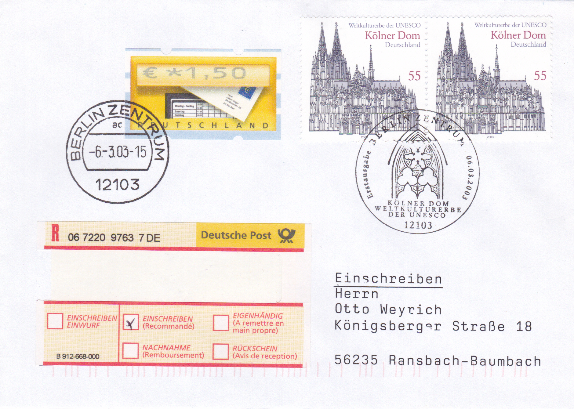 Brief per Übergabe-Einschreiben mit zwei Marken der Serie "UNESCO-Welterbe" der Deutschen Post (MiNr 2329) mit dem Kölner Dom und einer Automatenmarken zu je 1,50 €. Der beiden Marken mit dem Dom wurden mit dem Ersttagsonderstempel Berlin und die Zusatzfrankatur mit einem Tagesstempel Berlin gestempelt. Das Porto beträgt für den Brief bis 20g 55 Cent und die Zusatzleistung Übergabe-Einschreiben 205 Cent, zusammen also 260 Cent.