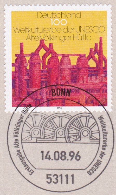 In der Serie "UNESCO-Welterbe" erschien auch eine Marke (MiNr 1875) mit der "Alten Völklinger Hütte". Hier zeige ich eine Marke mit dem Ersttagsonderstempel Bonn.