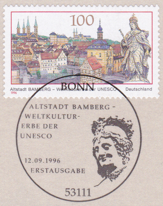 1996 erschien bei der Deutschen Post in der Serie "UNESCO-Welterbe" eine Marke (MiNr 1881) mit einer Stadtansicht mit Bamberger Dom, Neuer Residenz, Altem Rathaus und Kloster St. Michael und Kunigundenstatue. Hier zeige ich eine Marke mit dem Ersttagsonderstempel Bonn.