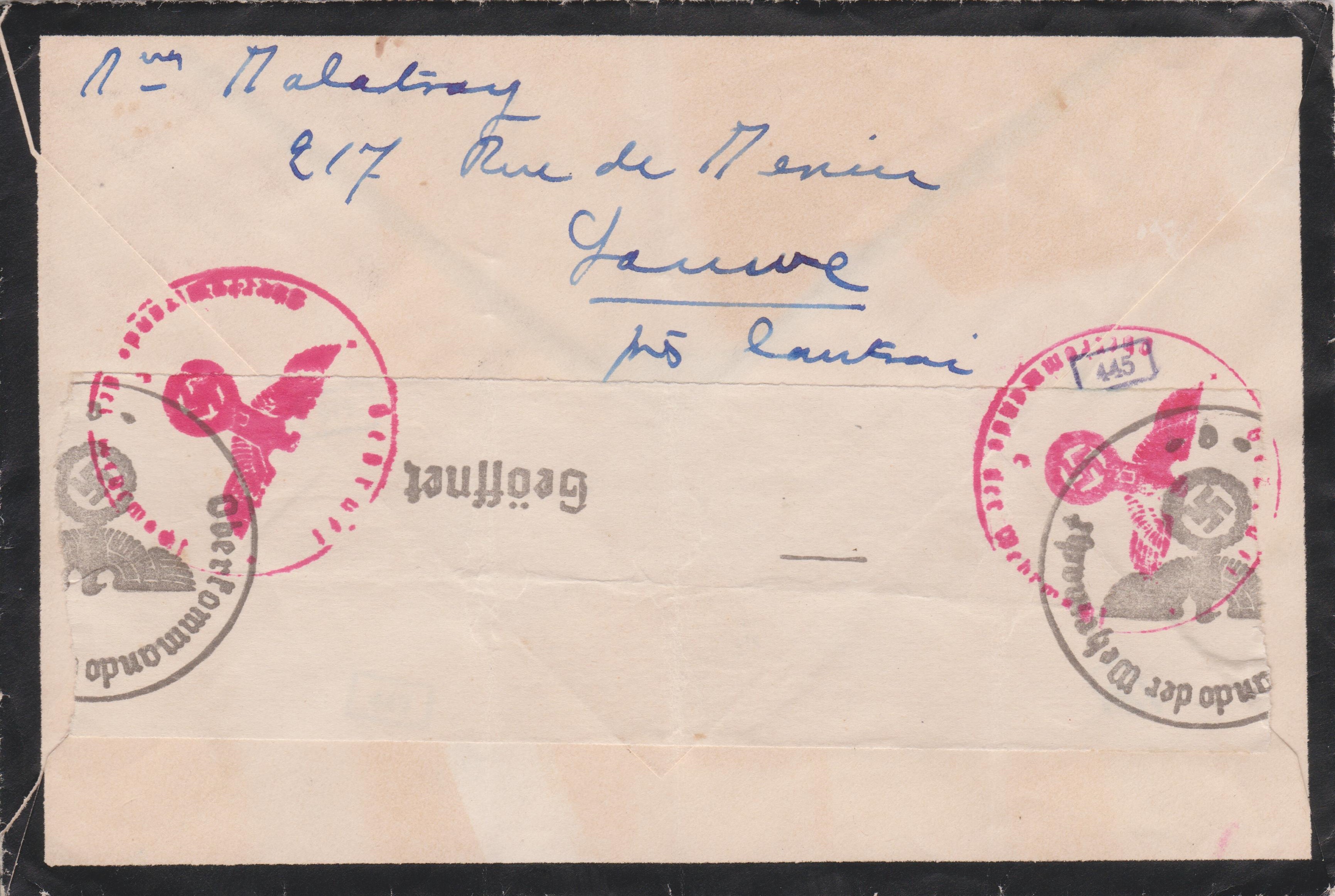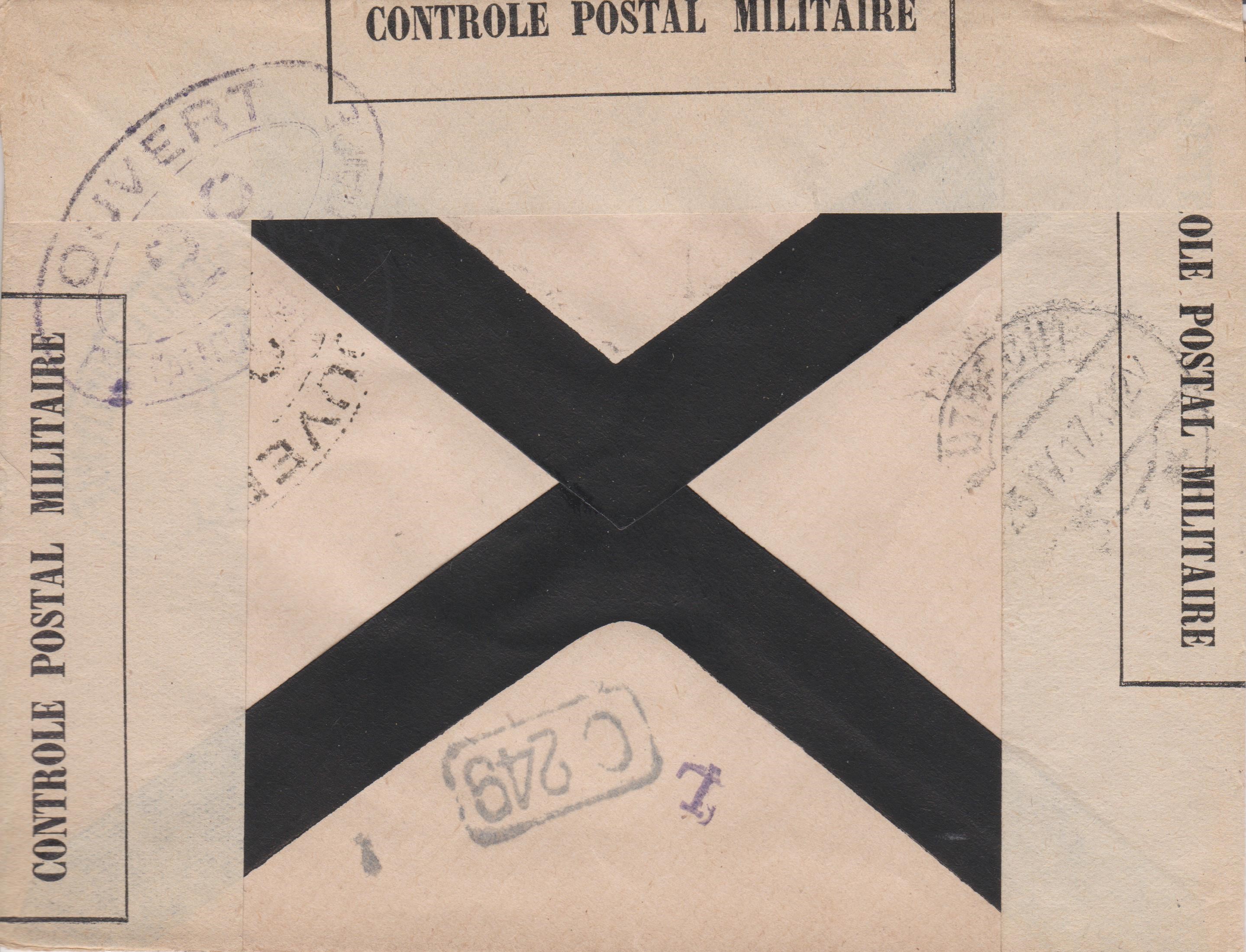 Der Brief wurde von der Militärzensur dreiseitig geöffnet und nach erfolgter Prüfung mit Klebezetteln wieder verschlossenn, was ovale Prüferstempel dokumentieren.