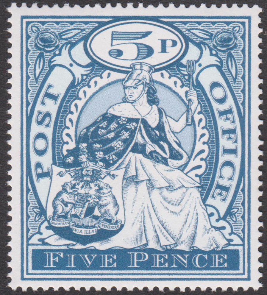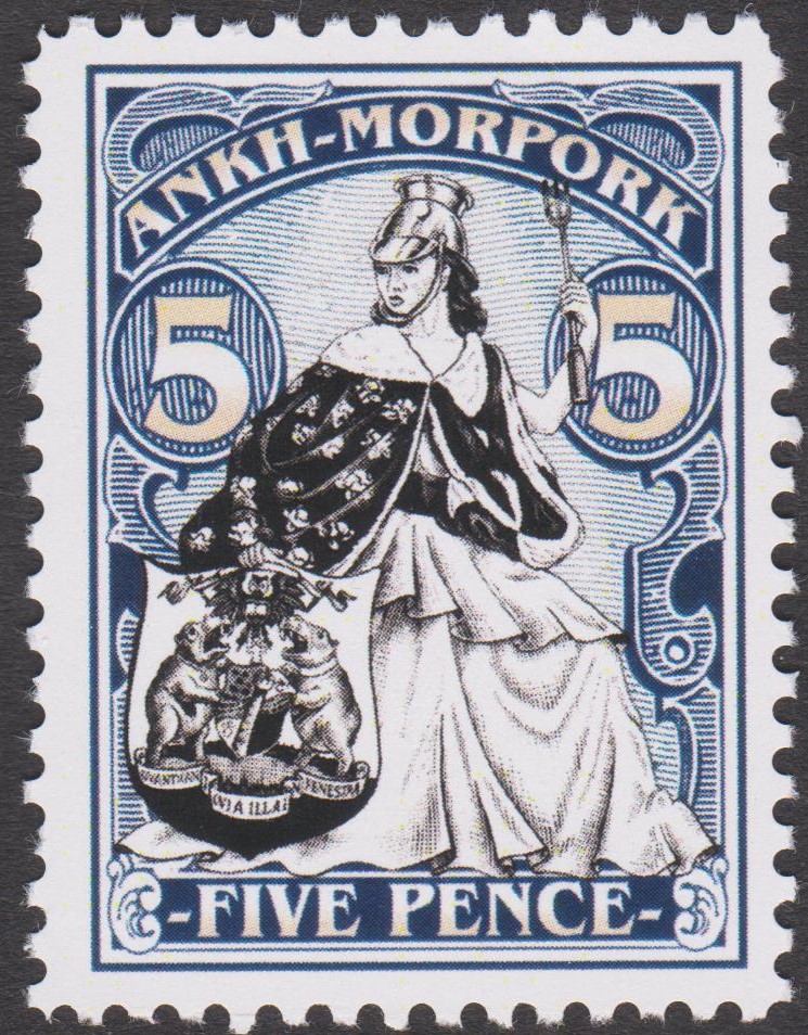 Hier drei Ausgaben mit der Darstellung von Morporkia mit ihrer Forke sowie der Inschrift "5 p POST OFFICE FIVE PENCE":