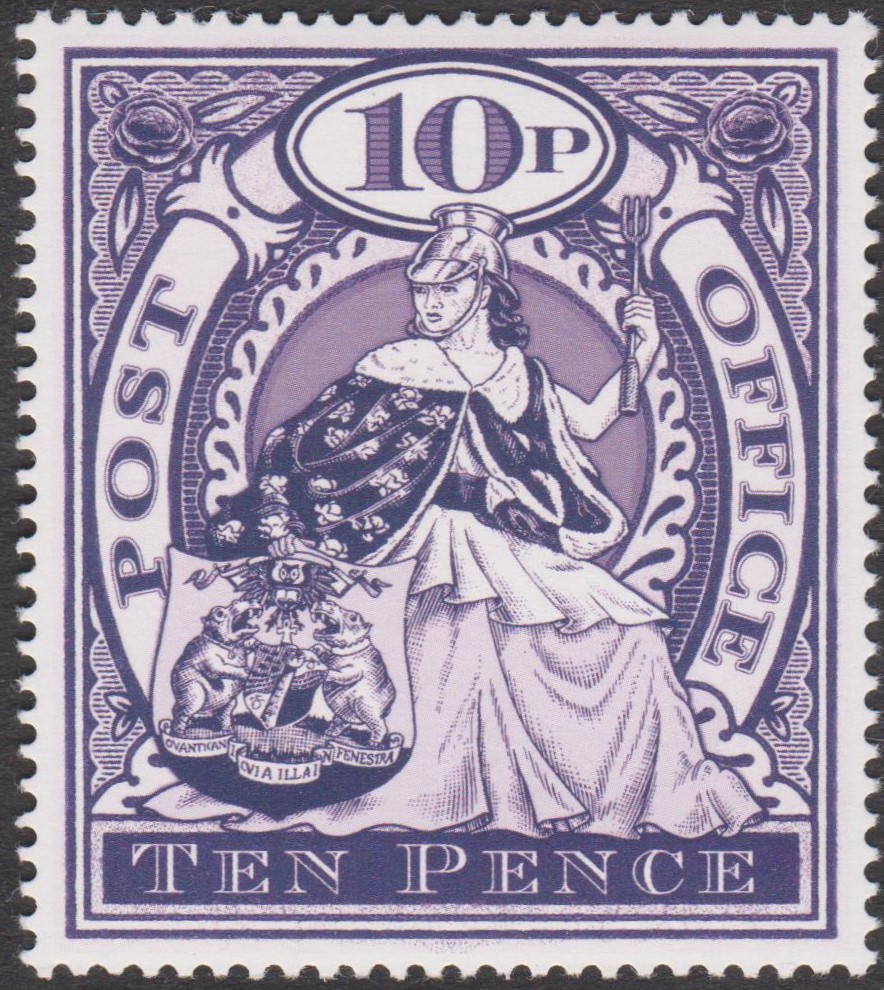 Hier eine Ausgaben Morporkia mit ihrer Forke sowie der Inschrift "10 p POST OFFICE TEN PENCE":