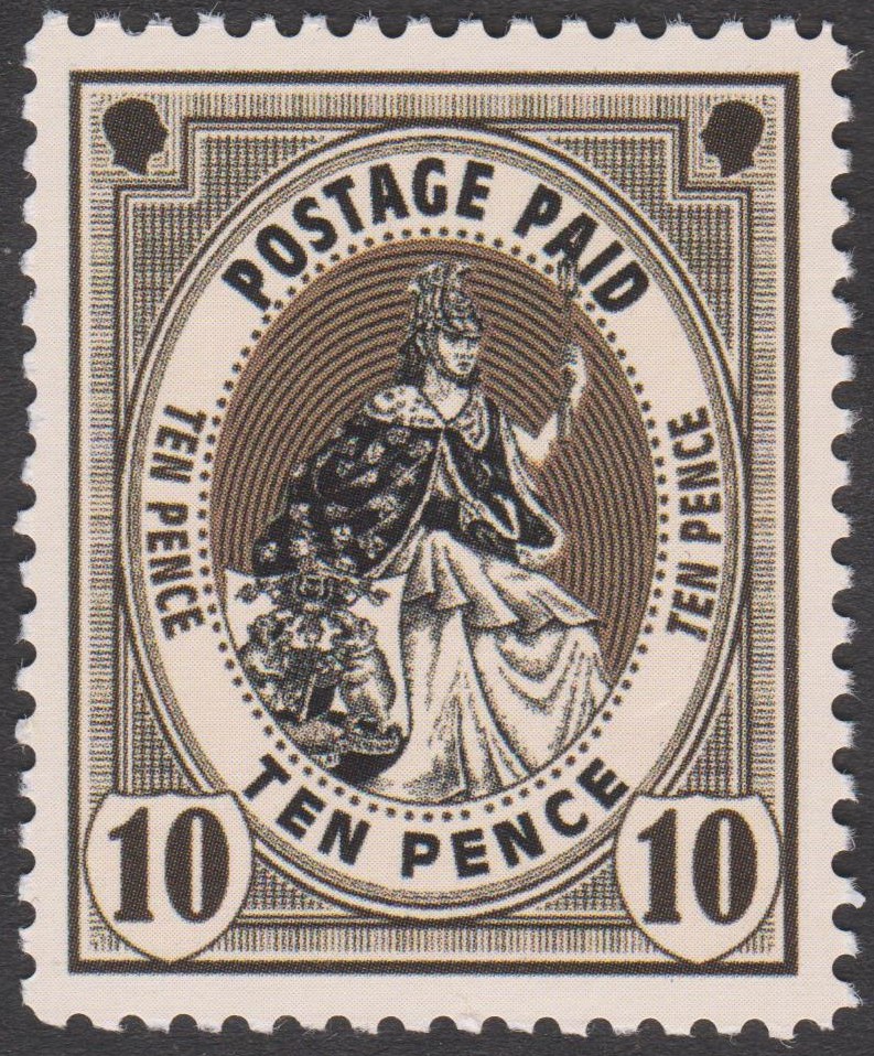 Ausgaben mit der Darstellung von Morporkia mit ihrer Forke sowie der Inschrift "POSTAGE PAID TEN PENCE":