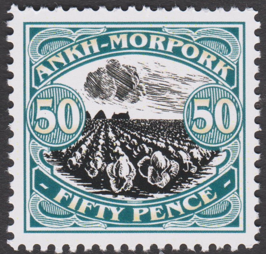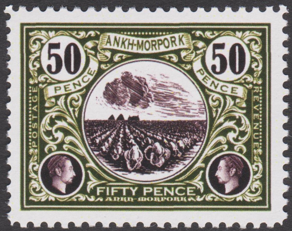Die Wertstufe FIFTY PENCE zeigt ein Kohlfeld und ist der "Cabbage Industry" von Ankh-Morpork gewidmet: