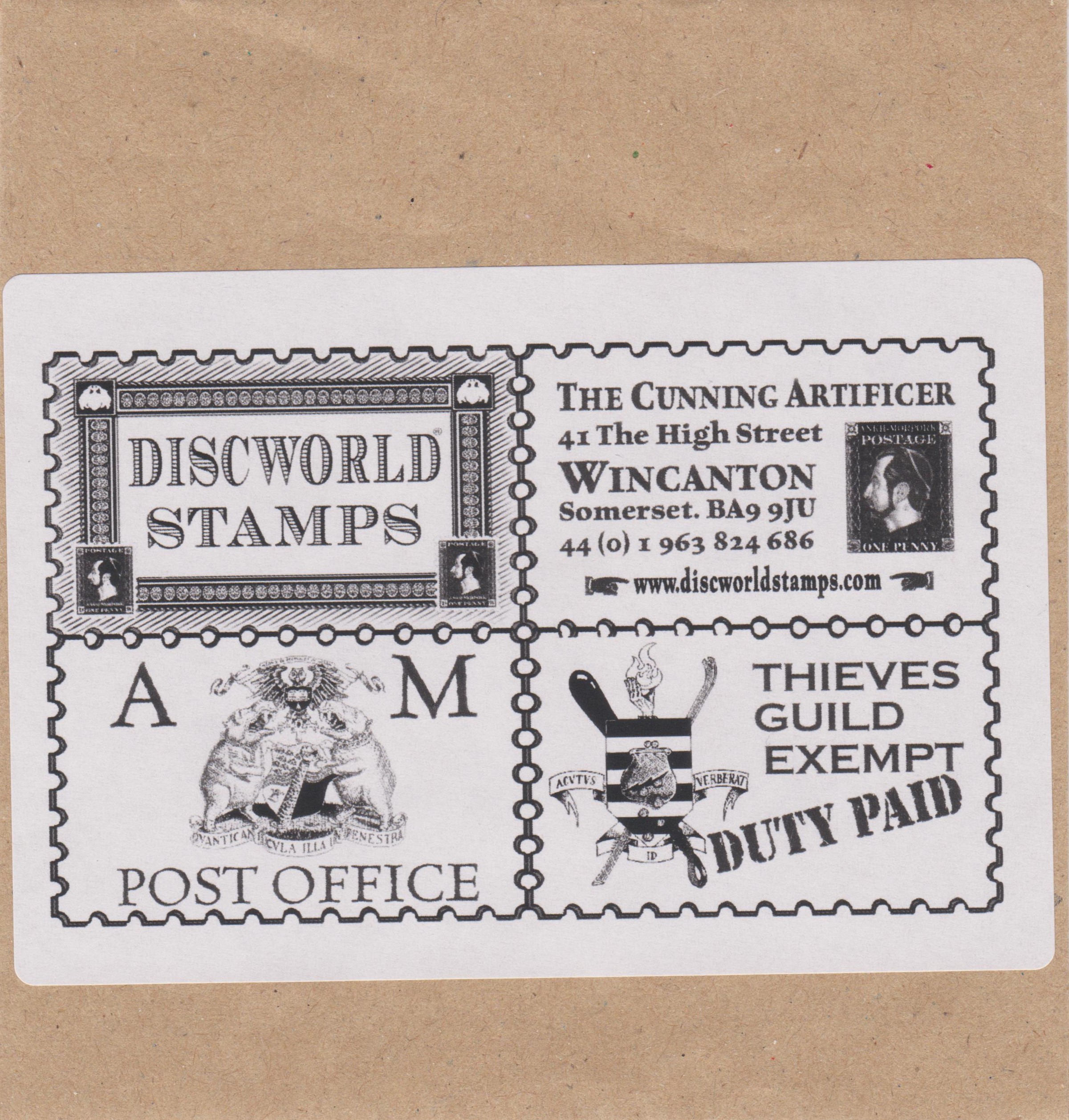 Hier ein Beispiel dafür, wie die Verpackung dieser "Briefmarken" der Scheibenwelt für die Abonnenten aussah, in der die Neuheiten zugeschickt wurden: