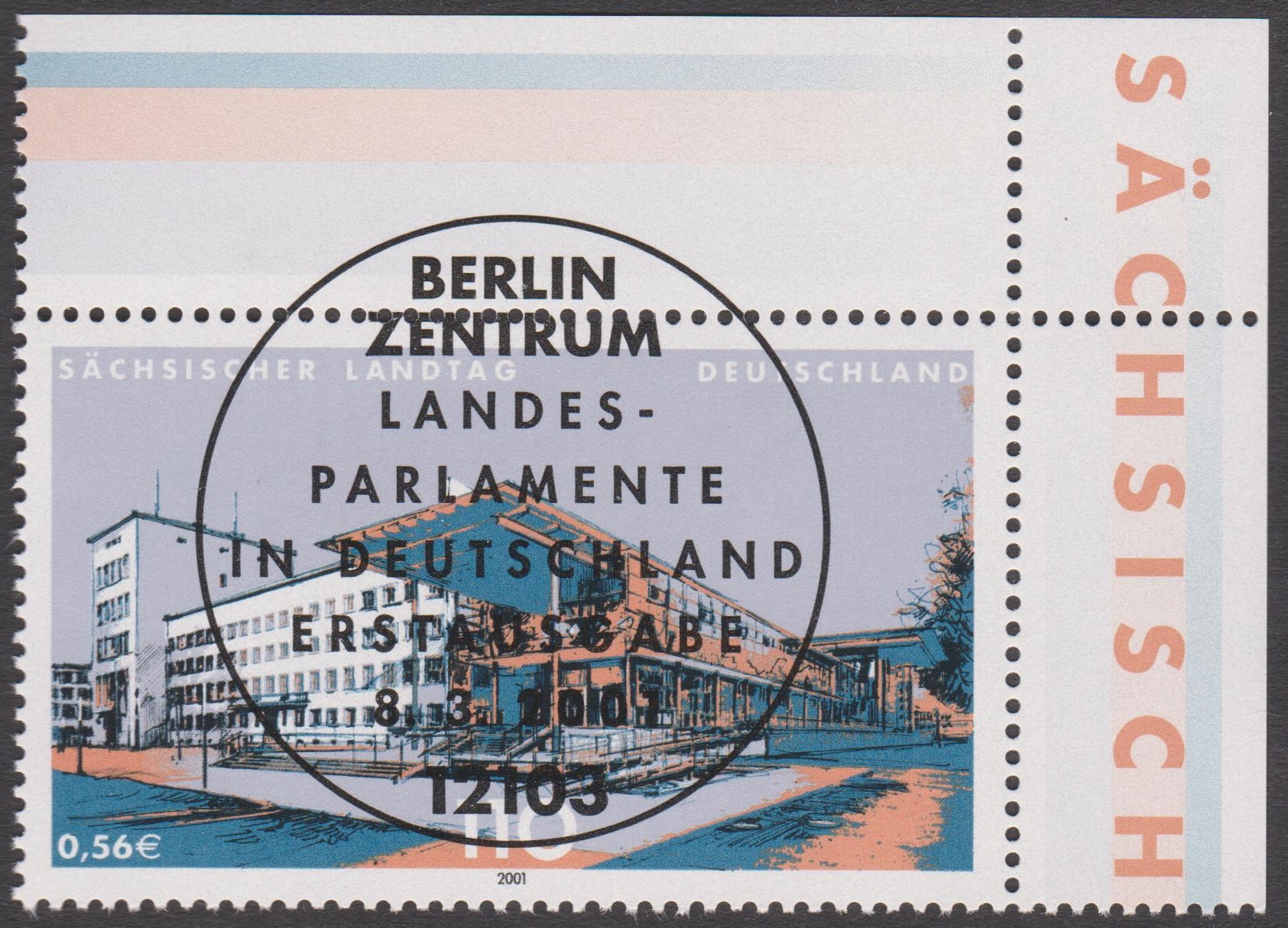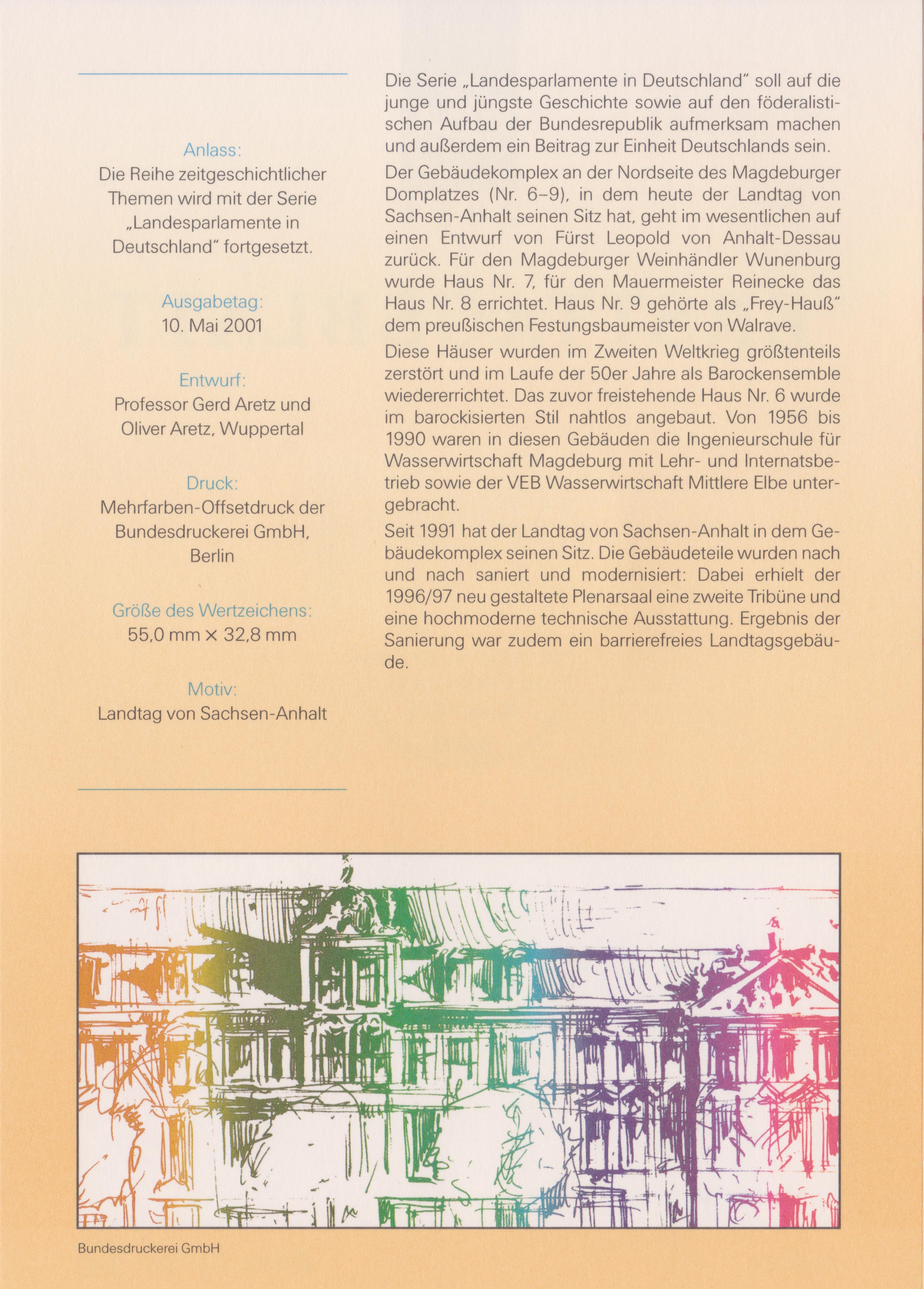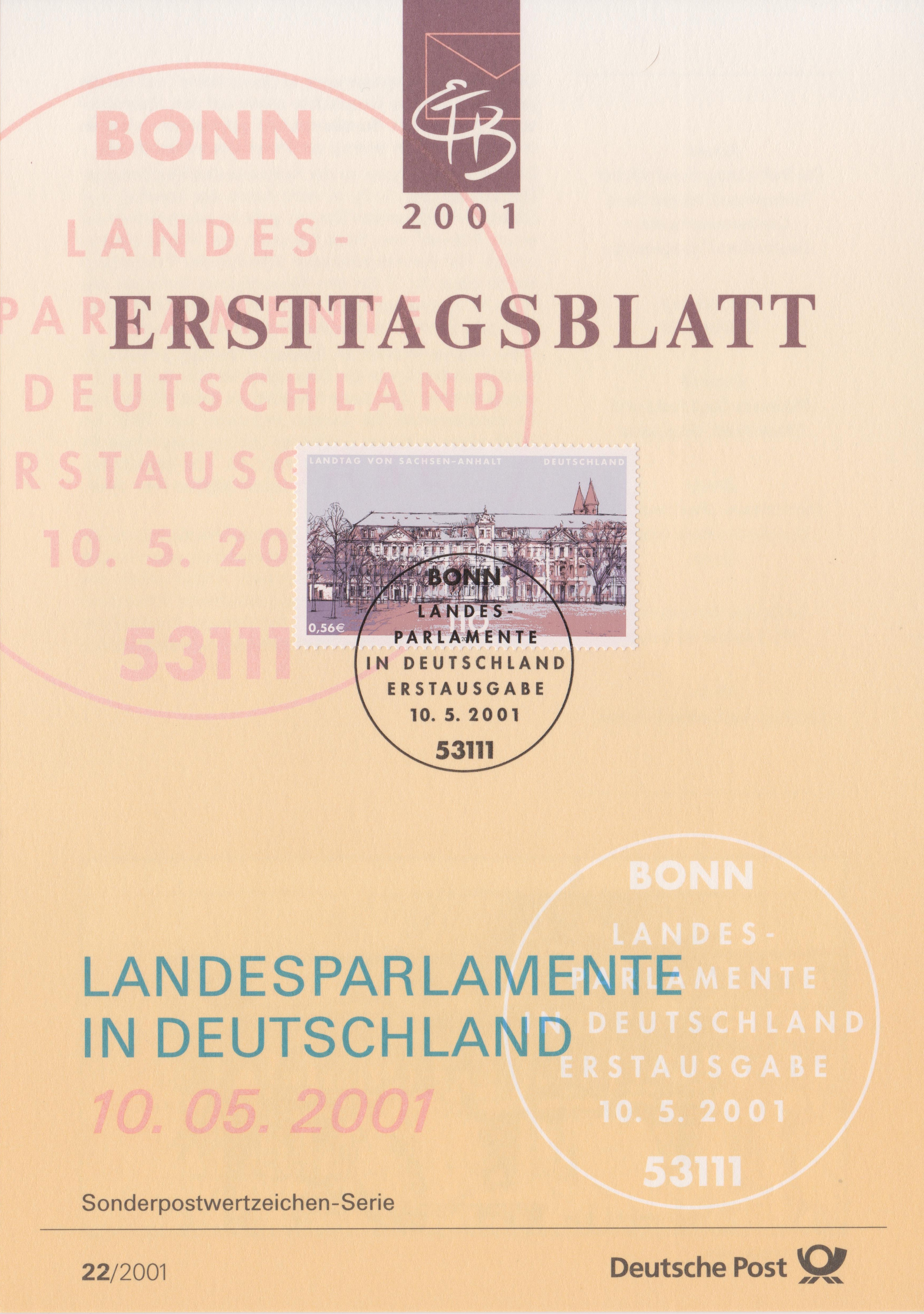 Dieses ETB 22/2001 zeigt das Motiv "Landtag von Sachsen-Anhalt in Magdeburg", Bund MiNr. 2184, aus einer Sonderpostwertzeichenserie "Landesparlamente in Deutschland":