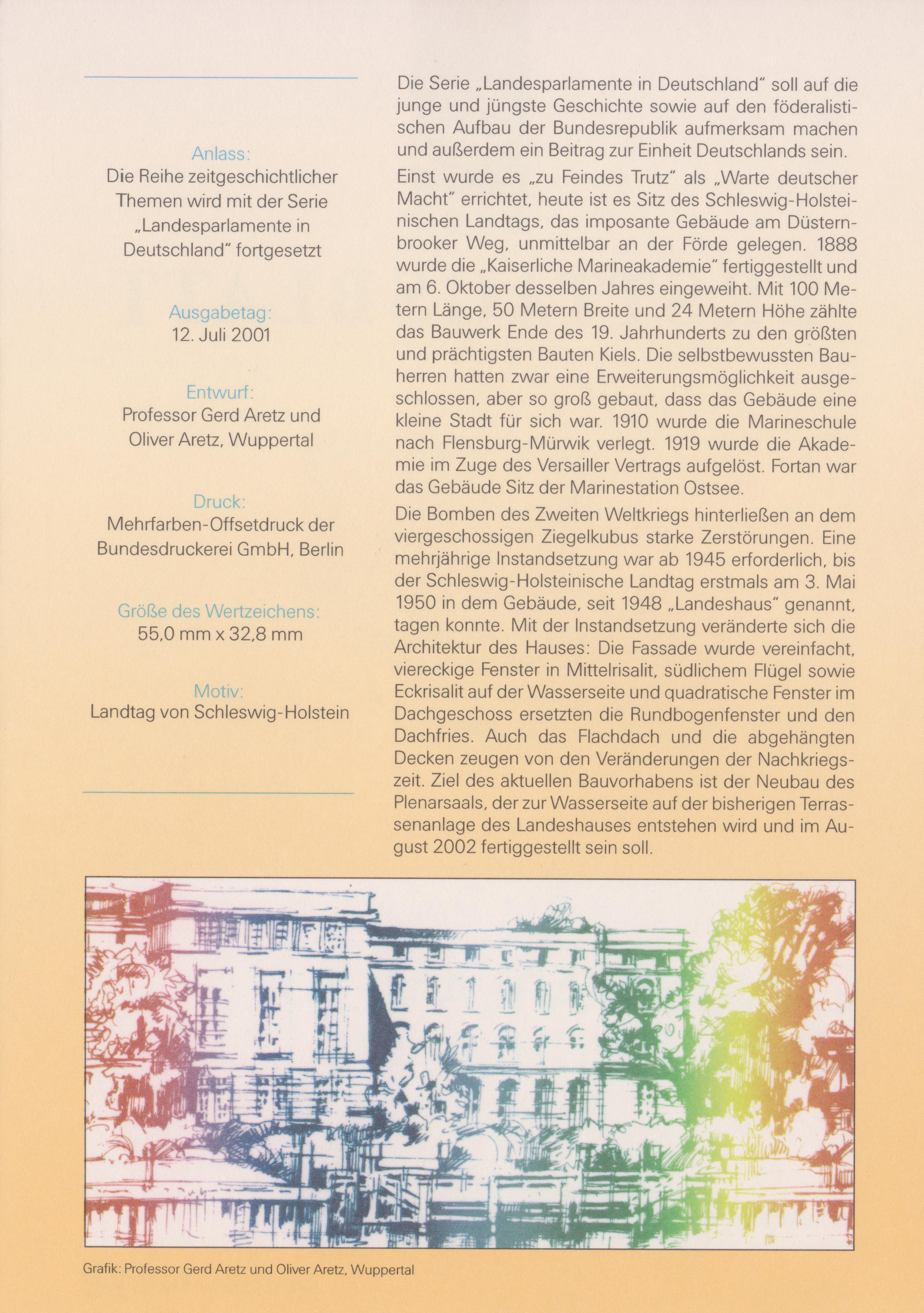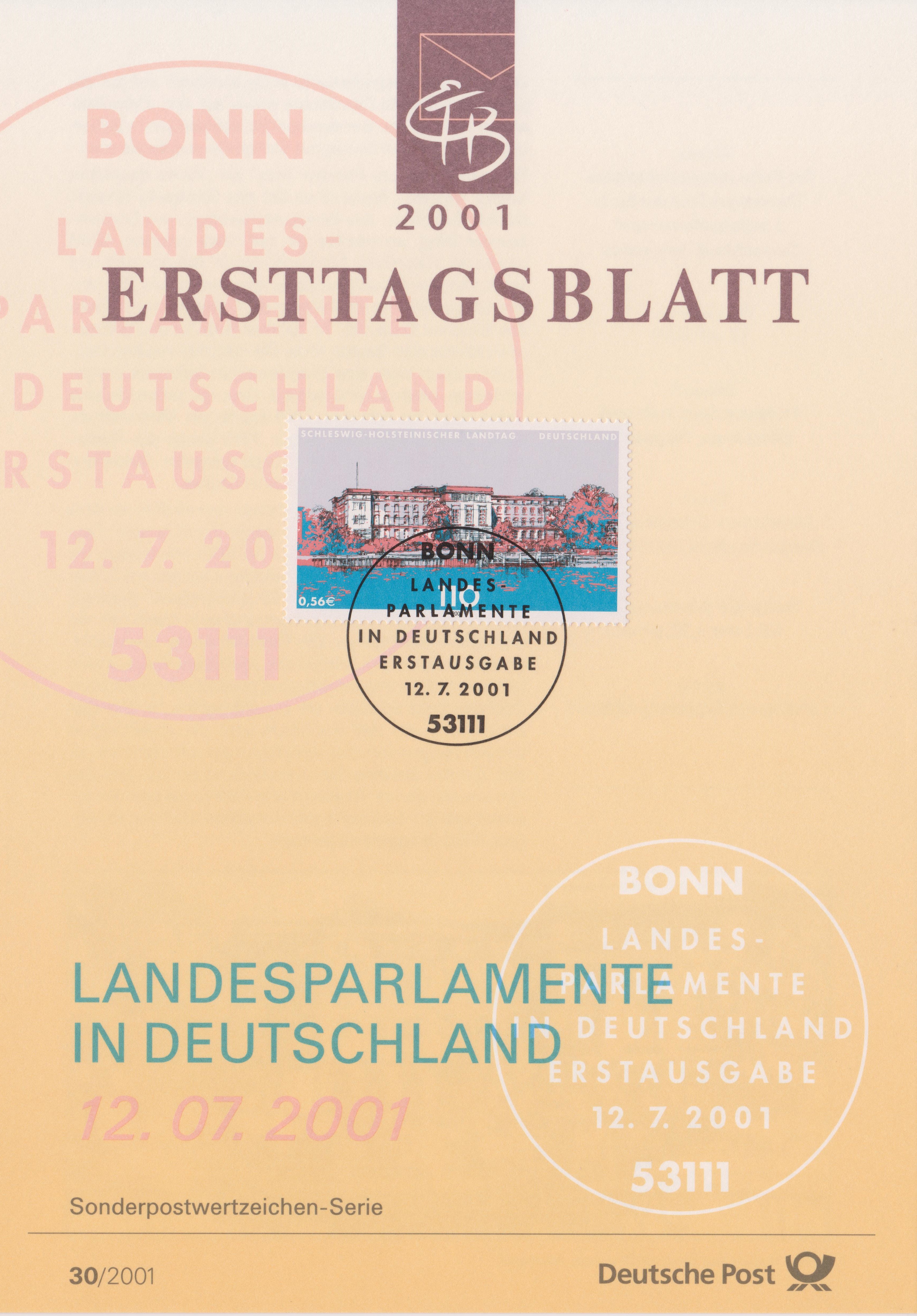 Dieses ETB 30/2001 zeigt das Motiv "Landtag von Schleswig-Holstein in Kiel", Bund MiNr. 2198, aus einer Sonderpostwertzeichenserie "Landesparlamente in Deutschland":