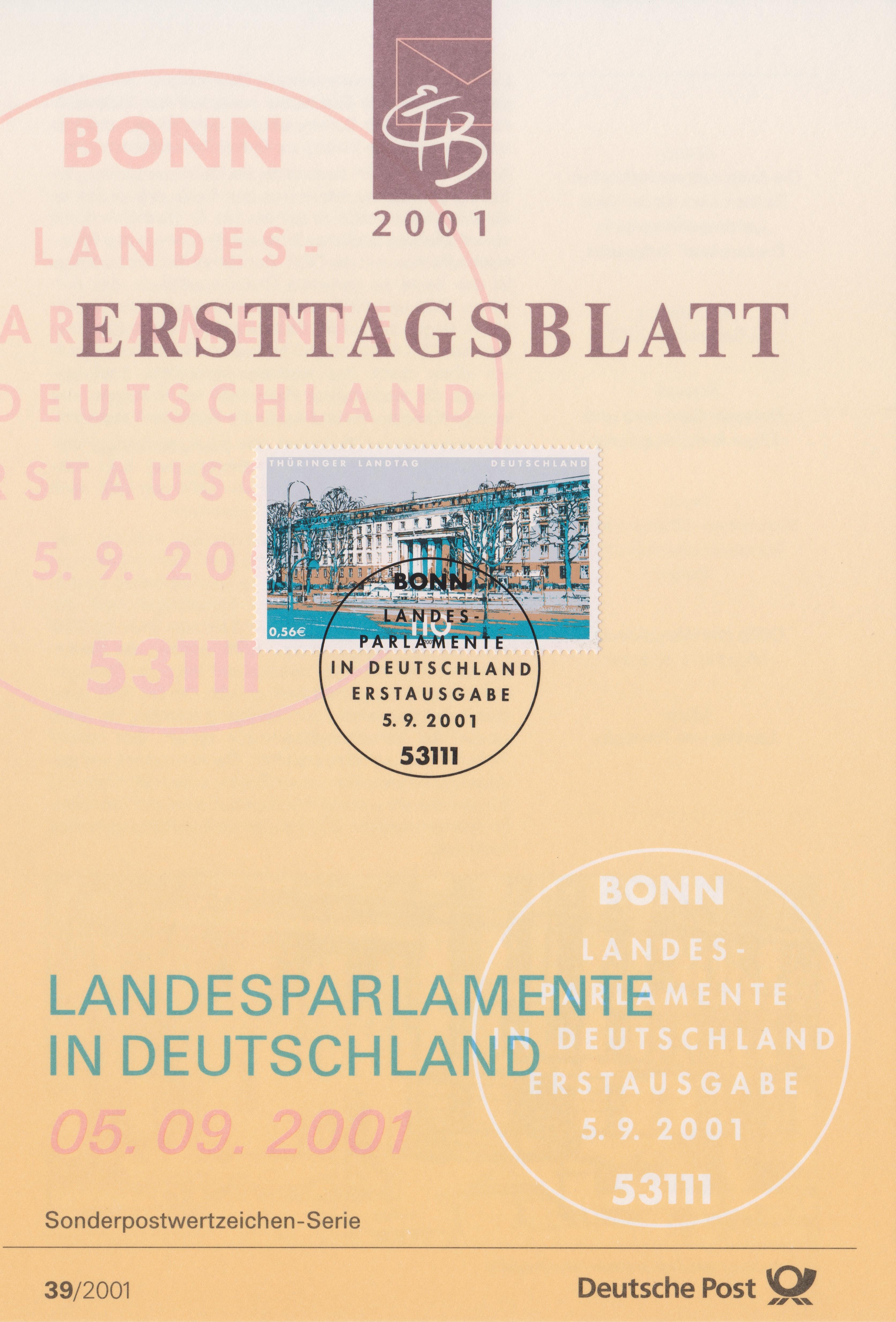 Dieses ETB 39/2001 zeigt das Motiv "Thüringer Landtag in Erfurt", Bund MiNr. 2213, aus einer Sonderpostwertzeichenserie "Landesparlamente in Deutschland":