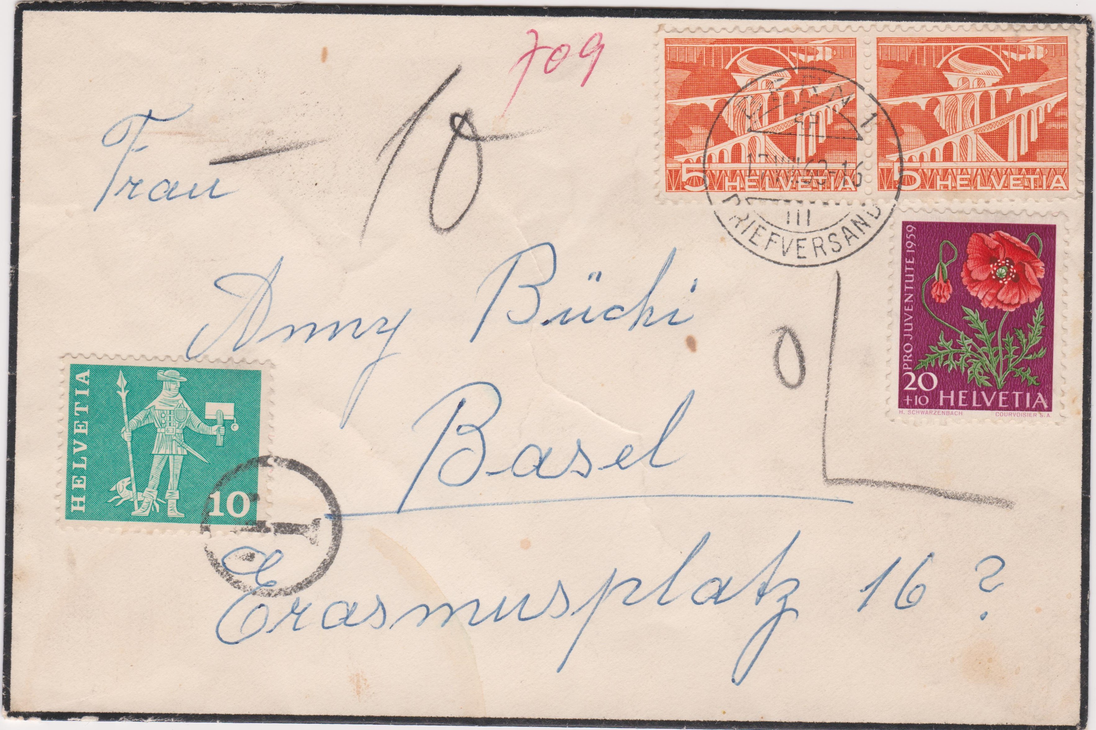 Das Postwertzeichen "PRO JUVENTUTE 1959" war nicht mehr gültig und wurde daher nicht gestempelt, sondern umrahmt. und es wurden "-10" Rappen als Nachporto vermerkt, die in Basel per mittels T-Stempel entwerteter Freimarke zu 10 Rappen erhoben wurden.