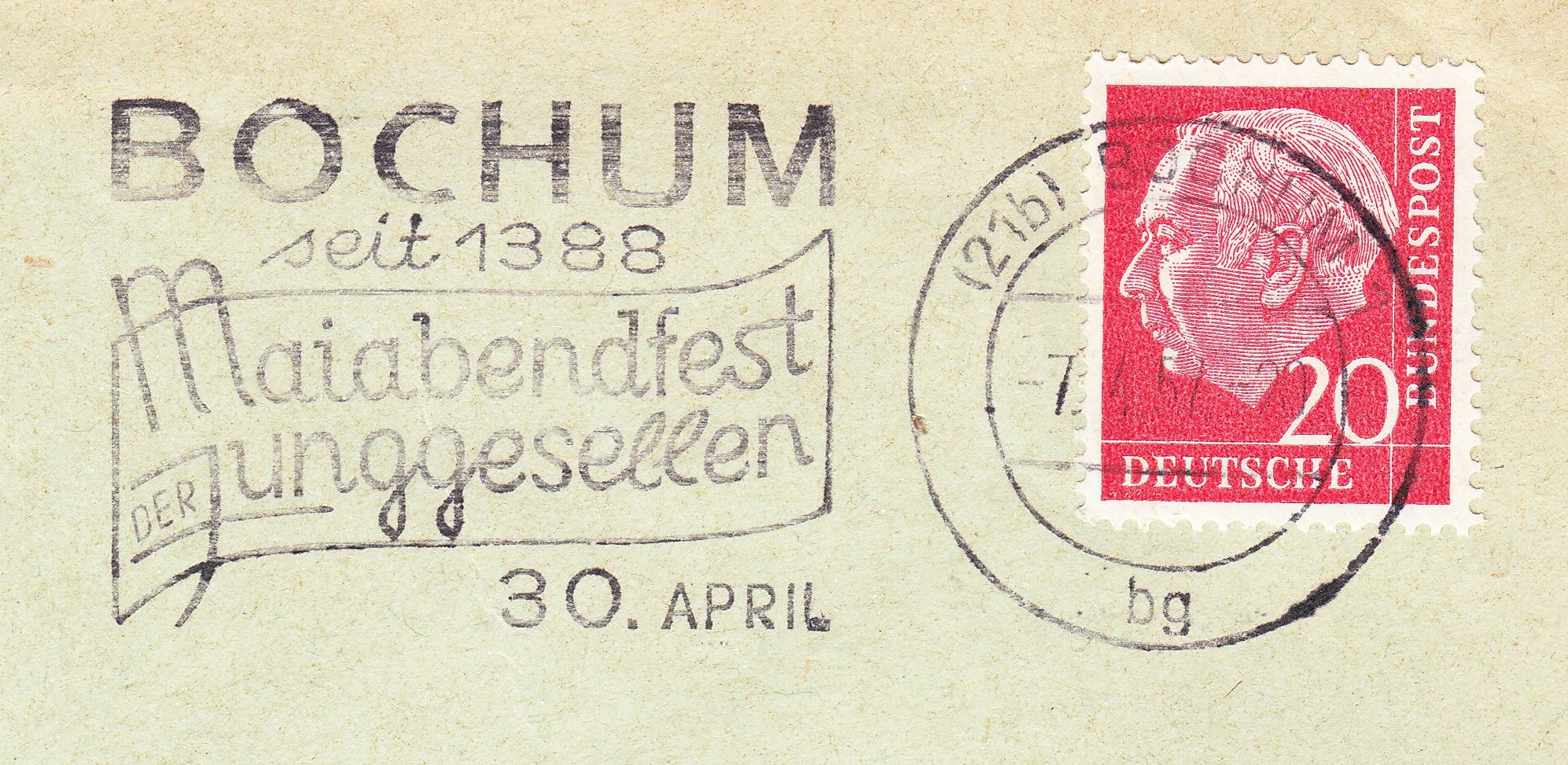 In den 1950er war das Maiabendfest als Stadtfest sehr populär und gut besucht. Aus dem Jahre 1957 stammt dieser zum Thema passende Maschinenstempel, der auf die bis 1388 zurück reichende Tradition hinweist: