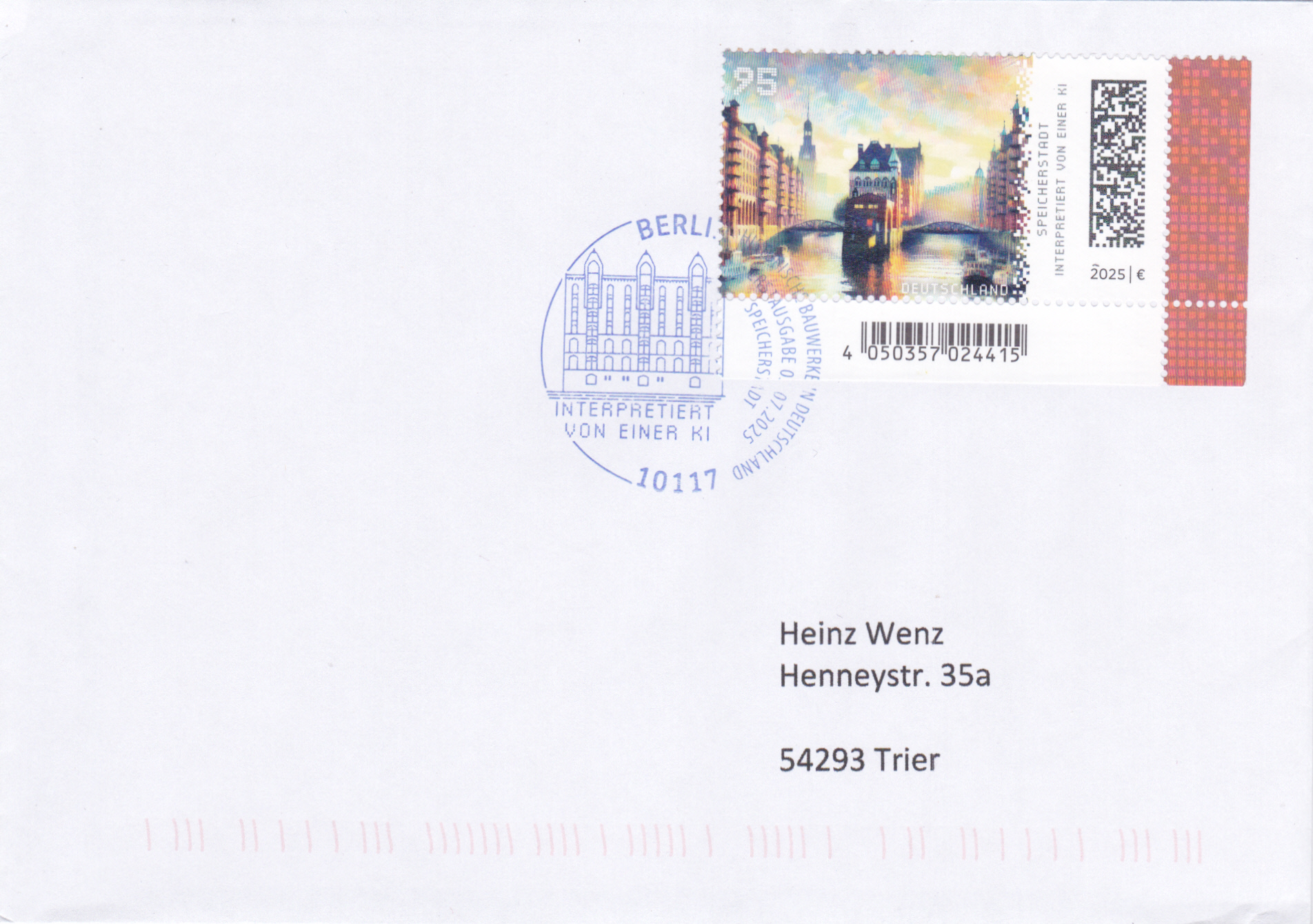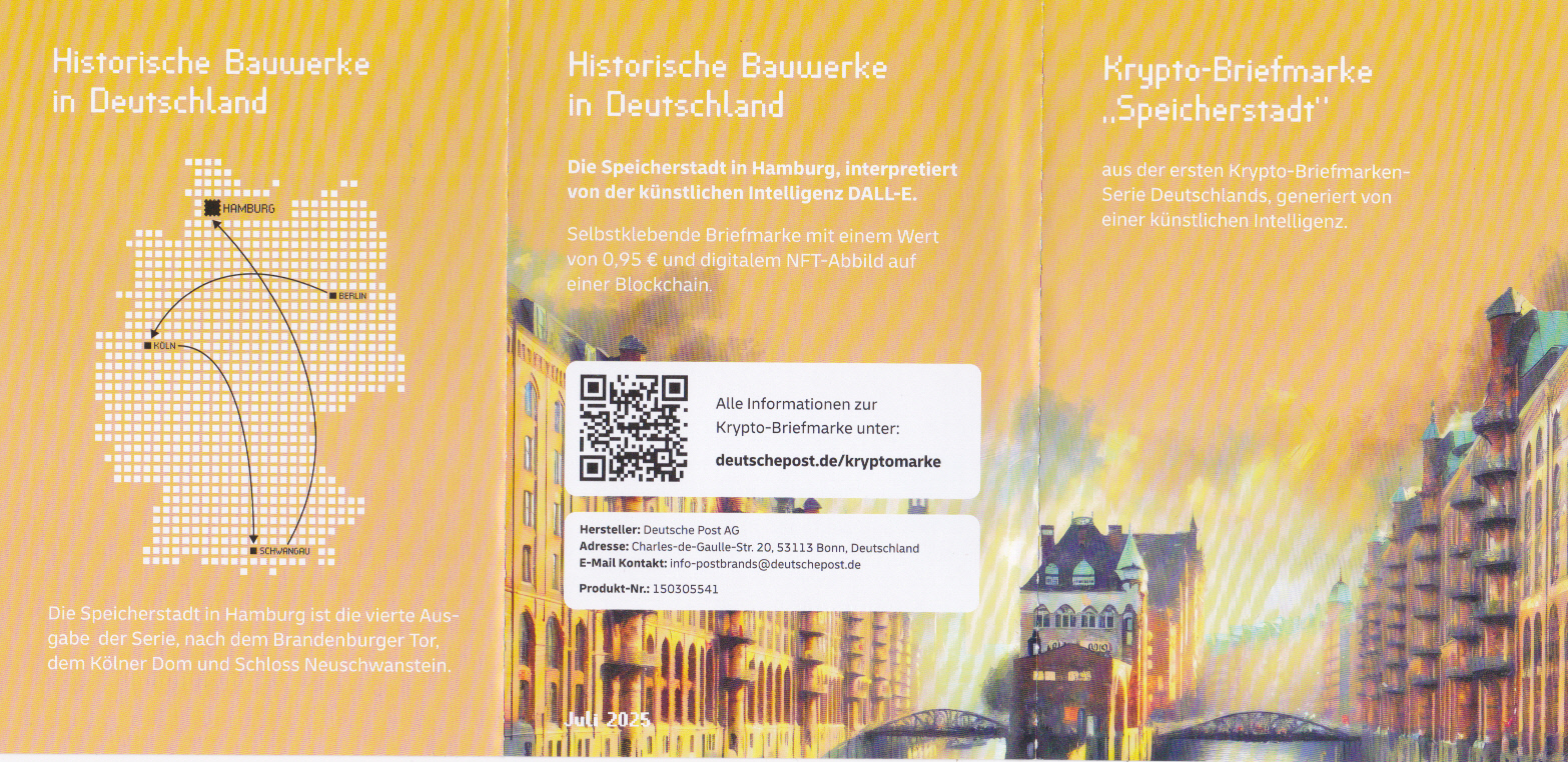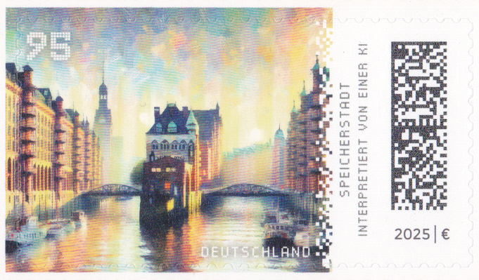 Es gibt auch eine motivgleiche selbstklebende Marke (MiNr 3917) mit der Speicherstadt in Hamburg als "Krypto-Marke".