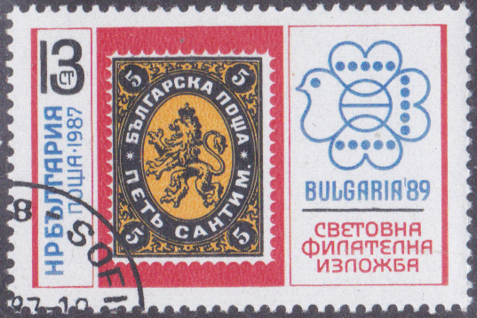 Eine Marke aus Bulgarien (MiNr 3596) zur Internationalen Briefmarkenausstellung BULGARIA ’89 in Sofia bildet die Marke Bulgarien MiNr 1 und das Ausstellungsemblem ab.