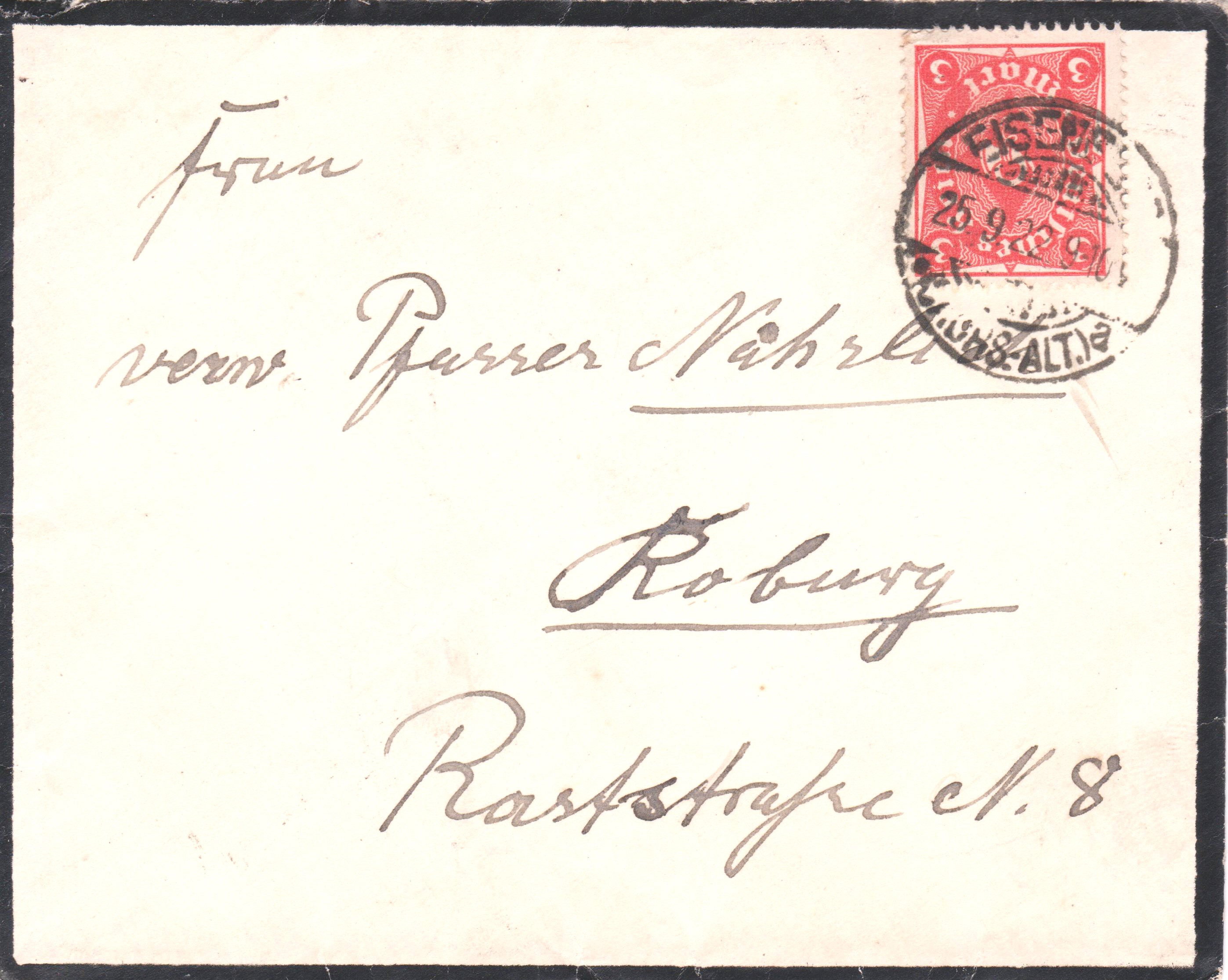 Trauerbrief, portogerecht als Brief im Fernverkehr freigemacht mit 3 Mark, aufgegeben am 25.09.1922: