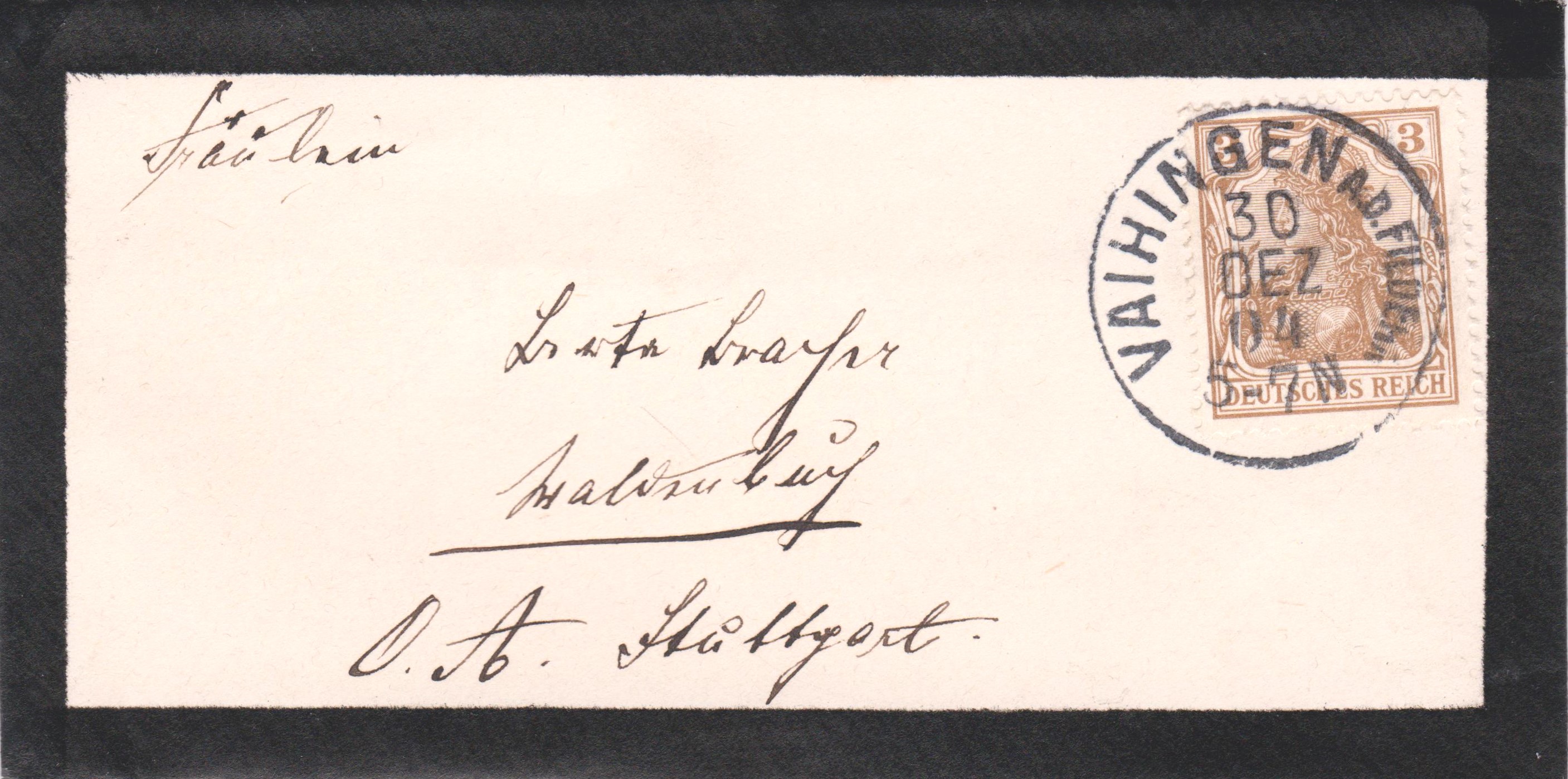 Trauerbrief, freigemacht mit 3 Pf Dauerserie Germania, gelaufen am 30.12.1904 von VAIHINGEN nach Stuttgart: