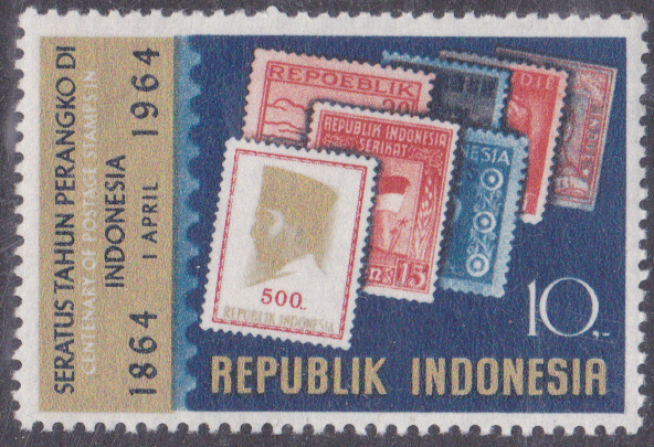 "100 Jahre Briefmarken in Indonesien" wird auf dieser Marke aus Indonesien (MiNr 443) mit Briefmarken aus der Zeit von 1864 bis 1964 dargestellt, ganz vorne die Marke Indonesien MiNr 434 aus 1964.