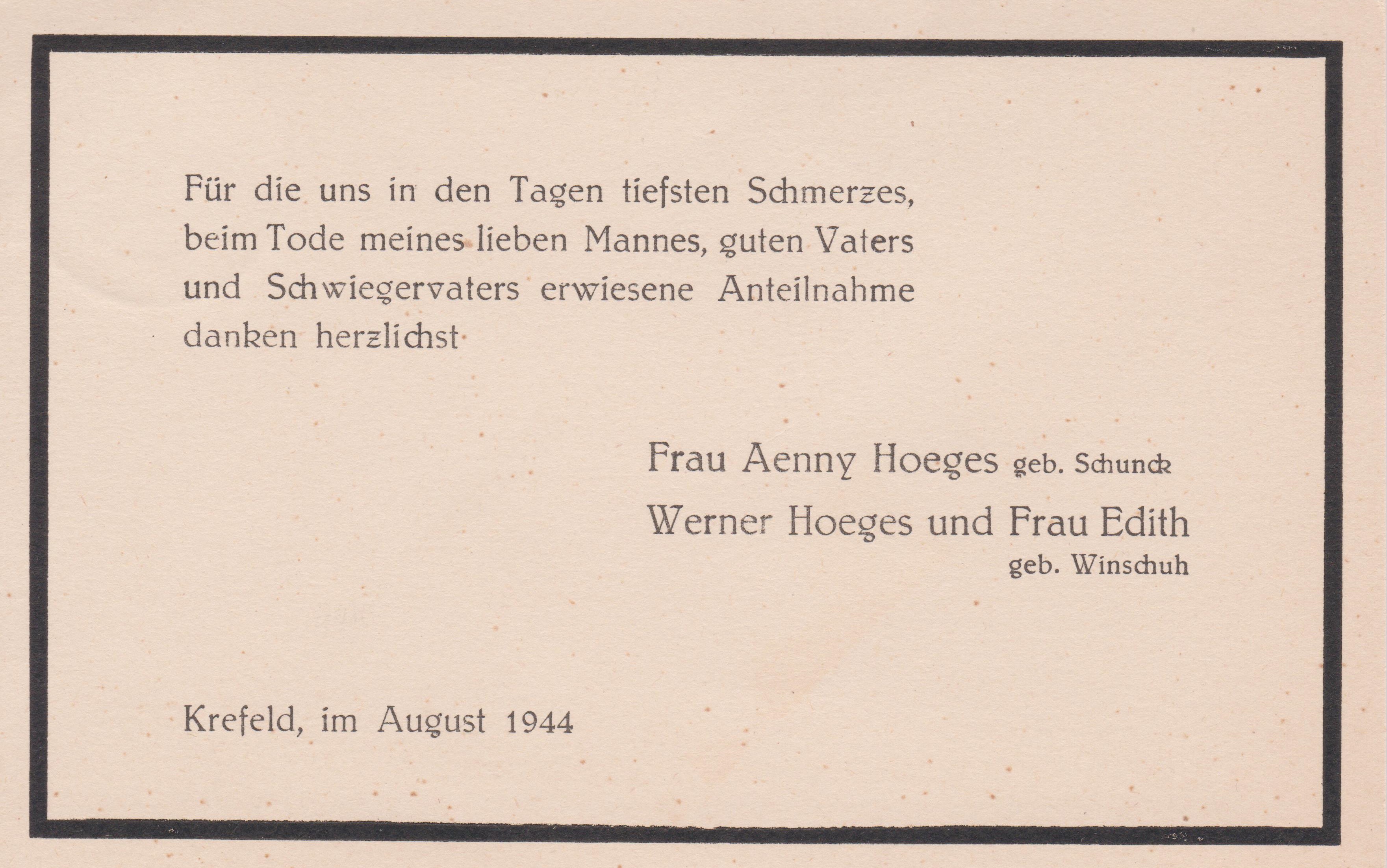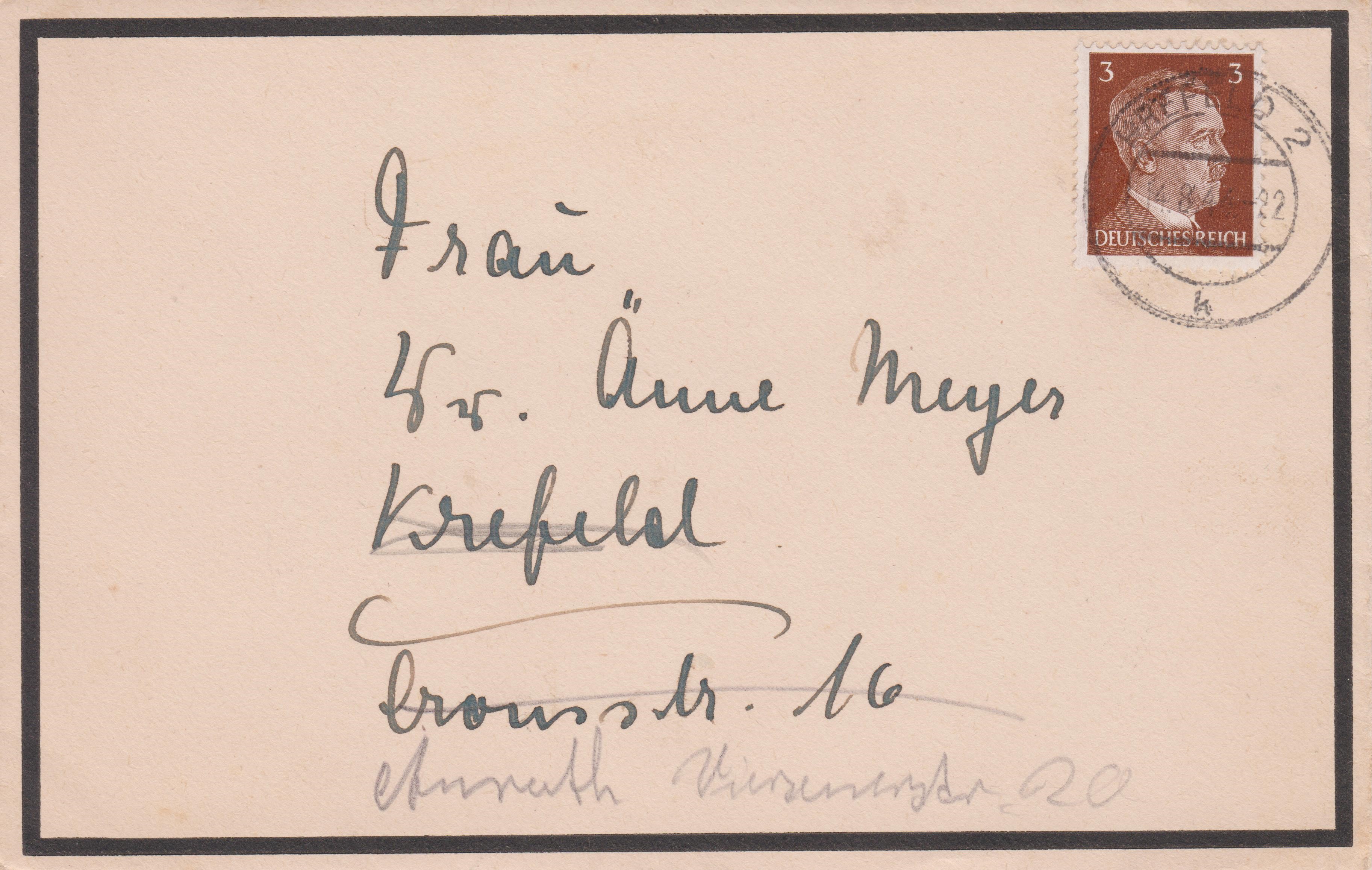 Einzelfrankatur 3 Pf Deutsches Reich MiNr. 782 auf Trauerdrucksache am 14.08.1944 in "KREFELD":