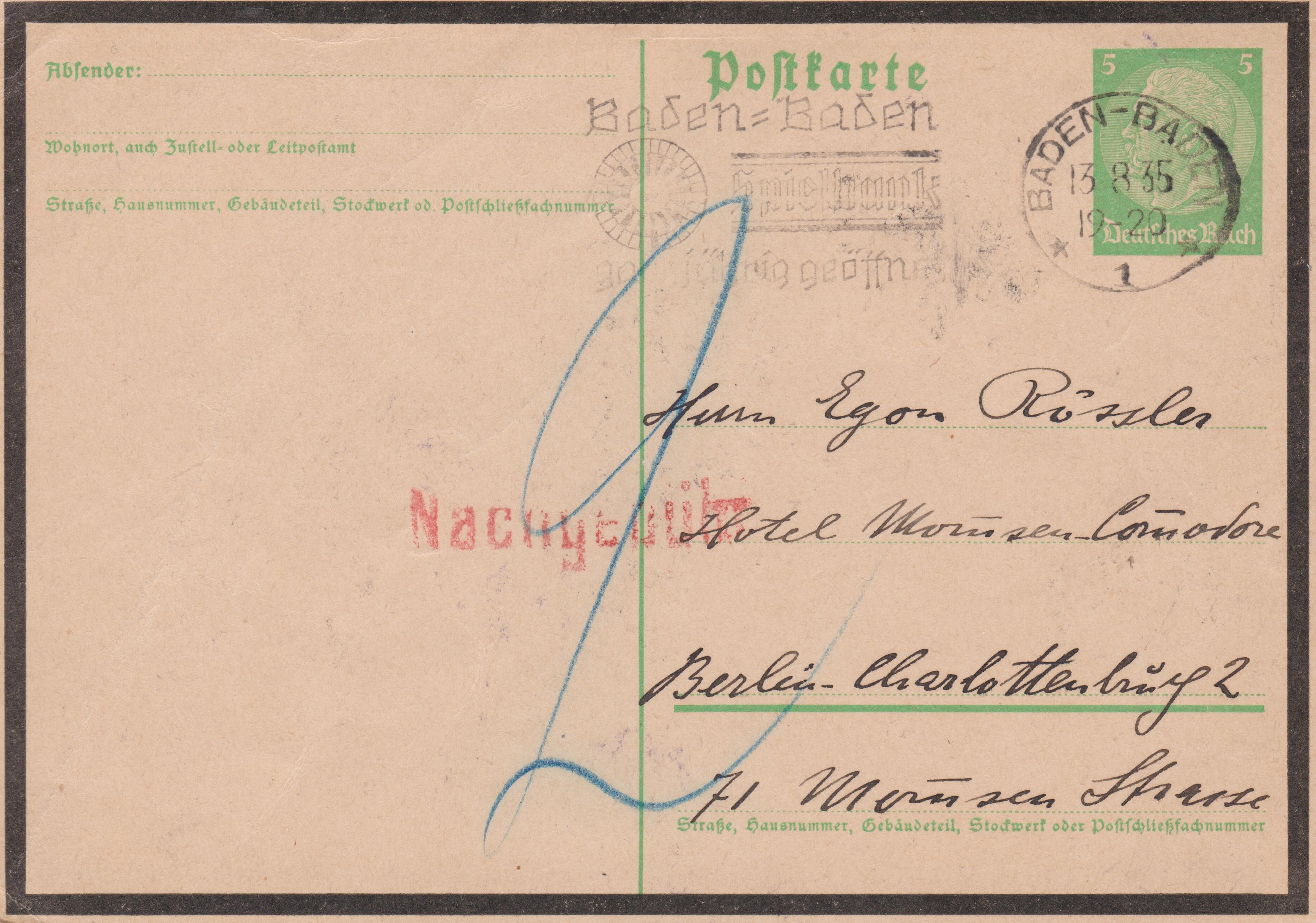 Postkarte der Dauerserie Hindenburg mit Trauerrand mit eingedrucktem Postwertzeichen zu 5 Pf, dem Porto für eine Postkarte im Ortsverkehr entsprechend, hier verwendeet am 13.08.1935 im Fernverkehr von BADEN-BADEN nach Berlin-Charlottenburg 2: