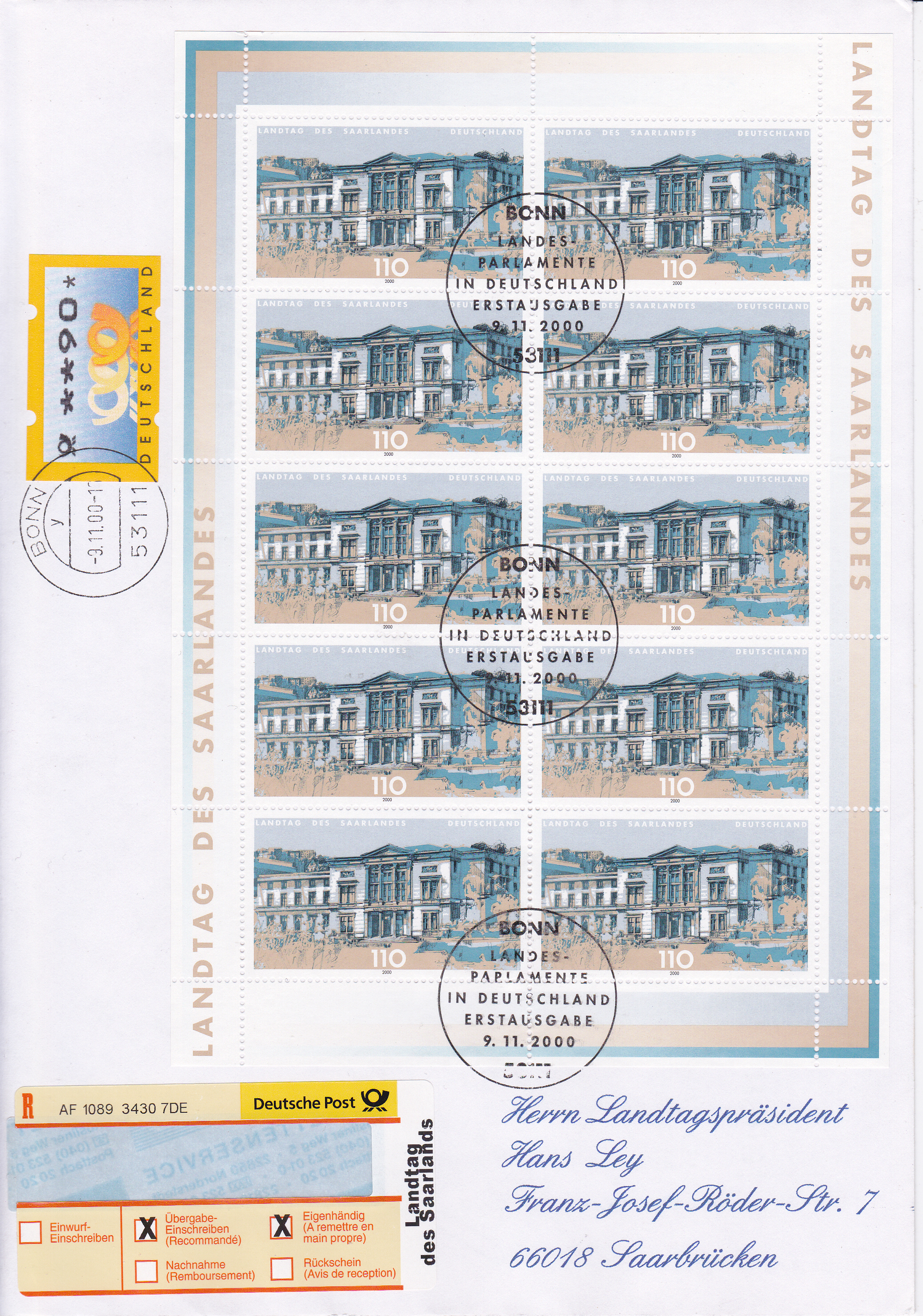 Brief vom Ersttag per Einschreiben Eigenhändig mit einem kompletten Bogen der Marke "Landtag Saarbrücken" (MiNr 2153) adressiert an den Landtagspräsidenten. Das Einschreibelabel trägt den Zusatz "Landtag des Saarlandes". Das Porto reicht aus für einen Brief bis 1000 Gramm (440Pf +400Pf Einschreiben + 350Pf Eigenhändig).