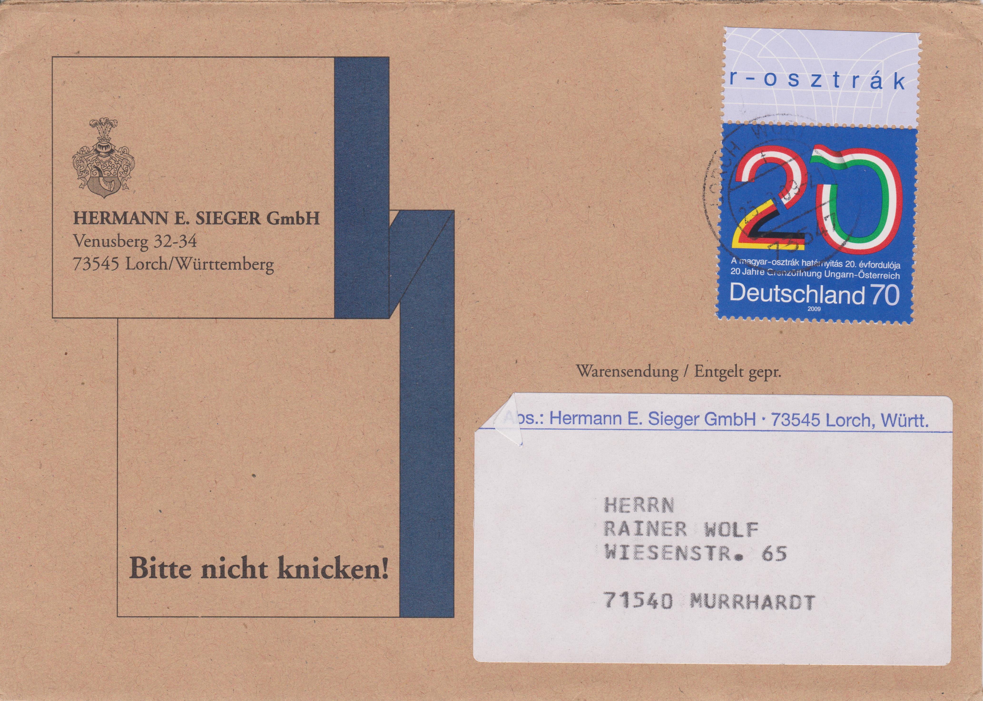 EF Bund 2759, portogerecht auf einer Warensendung von 21 bis 50 g, Portostufe 70 Pf, am 25.09.2009 von 73545 LORCH nach 71540 MURRHARDT: