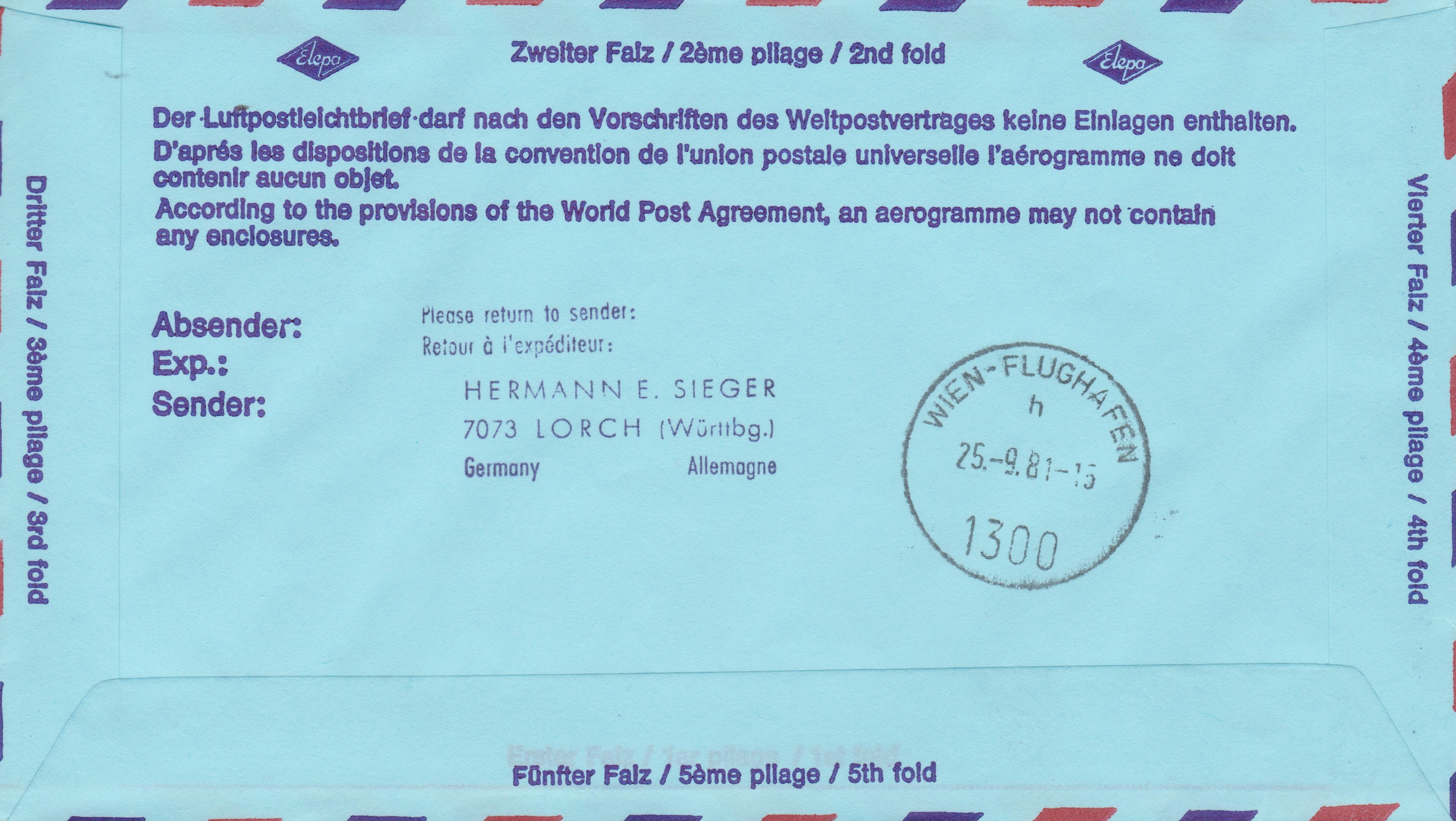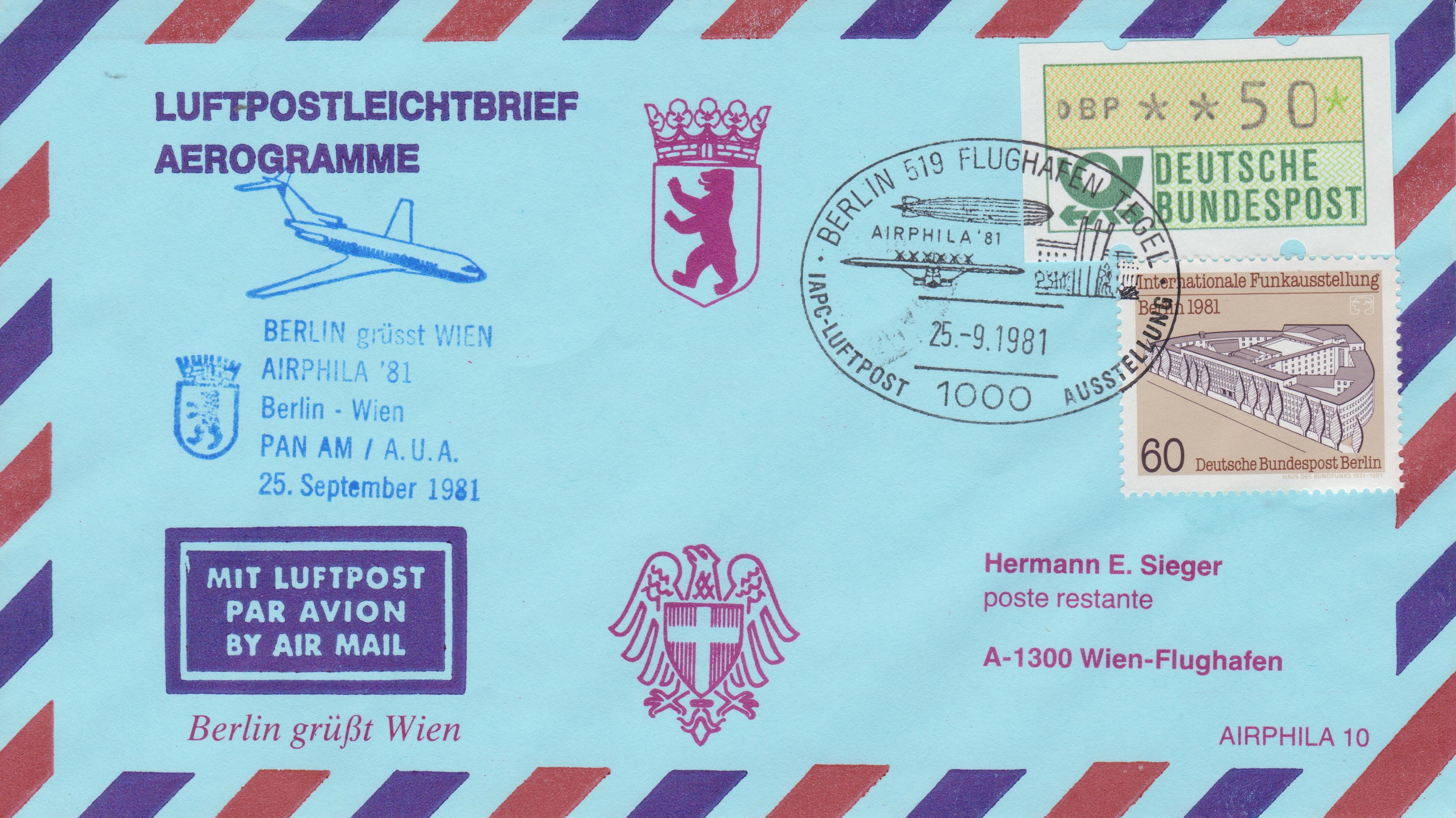 LUFTPOSTLEICHTBRIEF = AEROGRAMME, Portostufe 110 Pf, am 25.-9.1981 als "Grußpost" von der Firma Hermann E. Sieger dokumentiert, per Luftpost befördert von BERLIN 519 FLUGHAFEN nach A-1300 Wien-Flughafen: