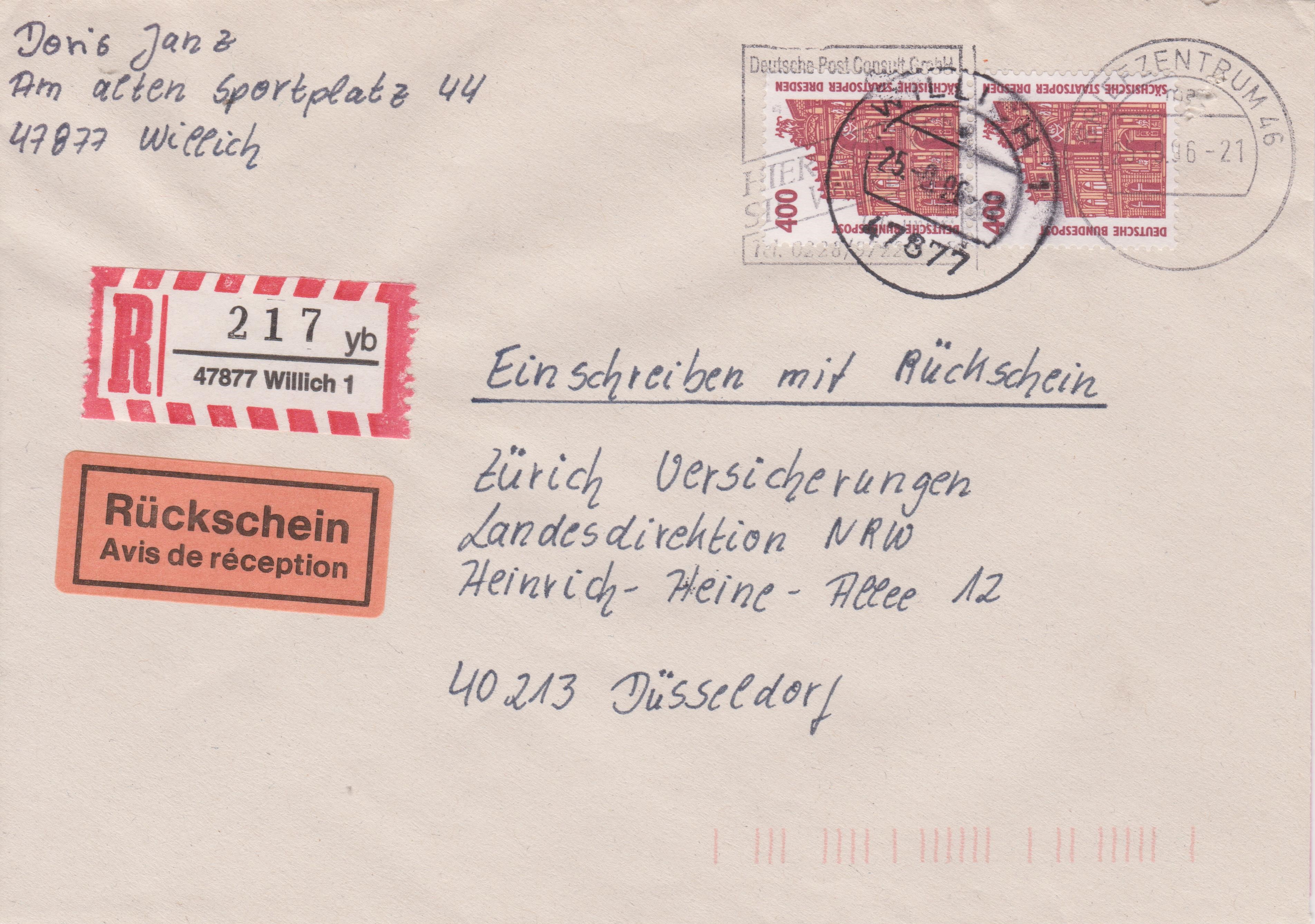 Brief, Porto 100 Pf, per Einschreiben, 350 Pf, mit Rückschein, 350 Pf, aufgegeben am 25.09.1996 in 47877 Willich 1: