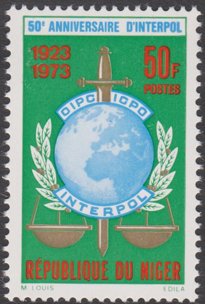 Niger MiNr. 369, erschienen aus Anlaß "50 Jahre Interpol", zeigt als Motiv das Interpol-Emblem: