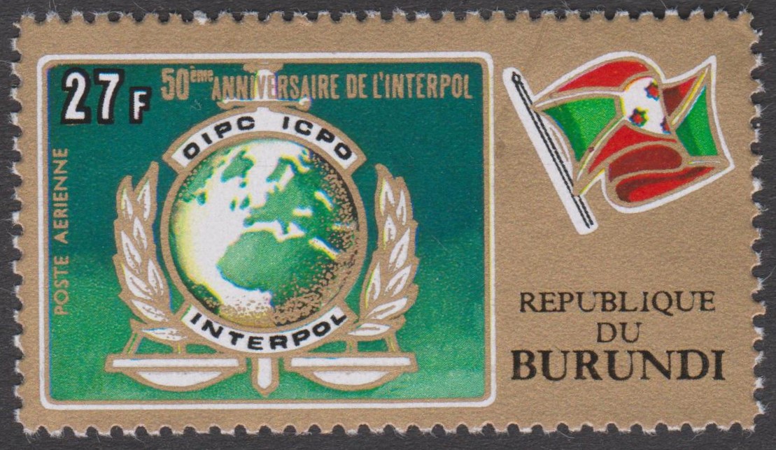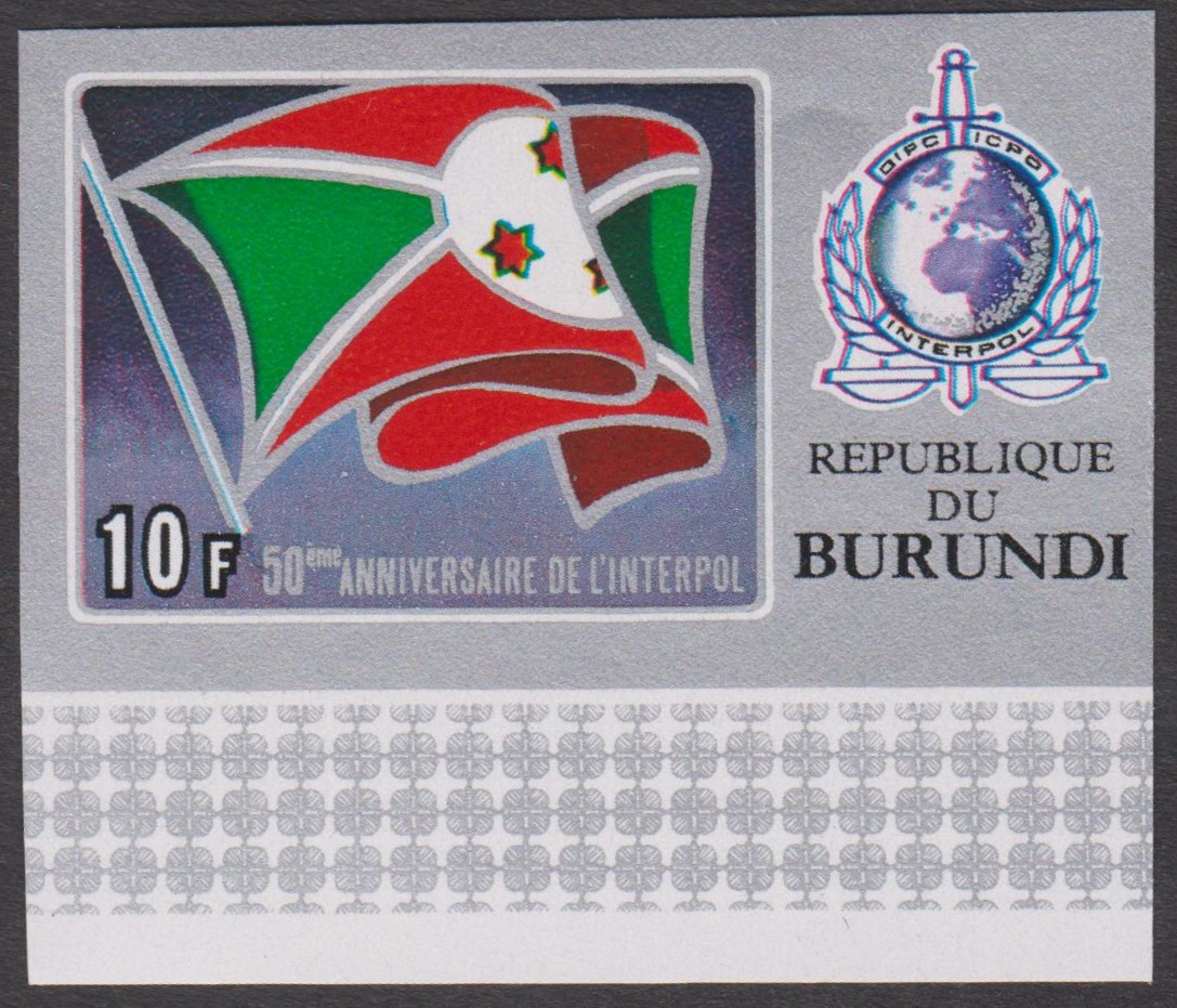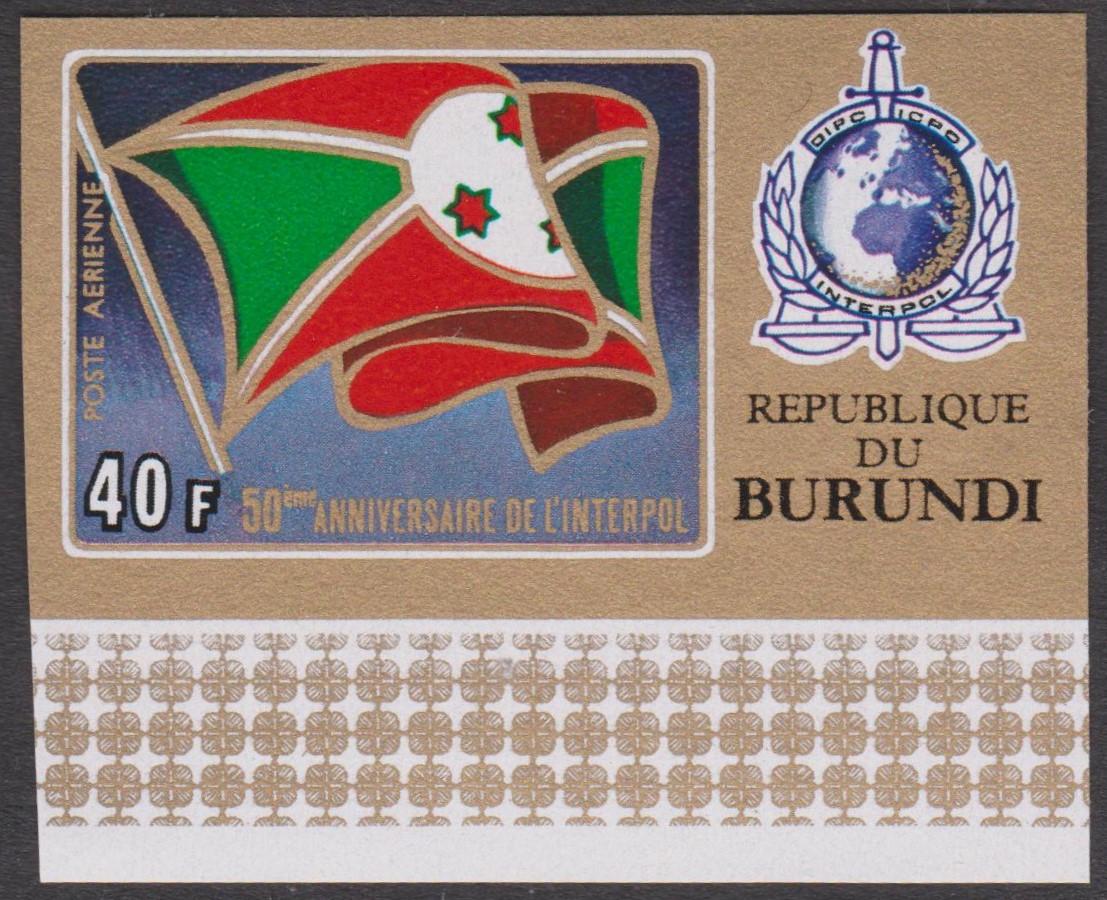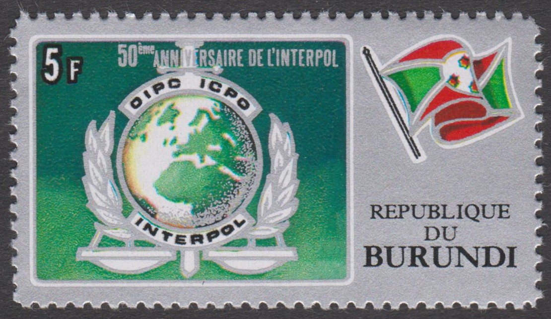 Burundi MiNr. 926A-930A (= gezähnt) sowie Burundi MiNr. 926B-930B (= geschnitten) erschienen am 19.05.1973 aus Anlass "50 Jahre Interpol":