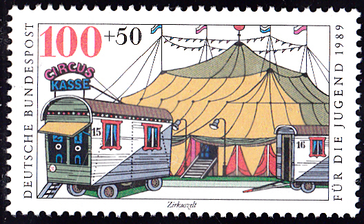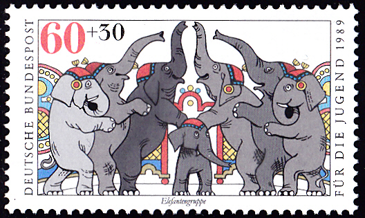 Bei der Deutschen Bundespost erschienen die Jugendmarken 1989 zum Thema Zirkus. Die Marke zu 60+30Pf (MiNr 1411) zeigt eine Elefantengruppe bei einer Vorführung.