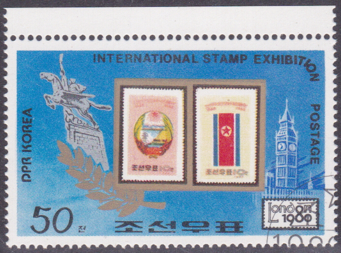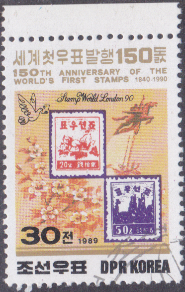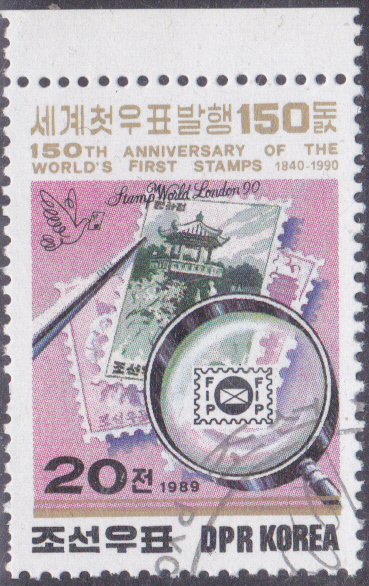 Aus einer Serie zum Jubiläum "150 Jahre Briefmarken" und zur Internationalen Briefmarkenausstellung STAMP WORLD LONDON ’90 kann ich diese Marke aus Korea-Nord (MiNr 3046) mit Briefmarken aus Nordkorea unter einer Lupe zeigen.