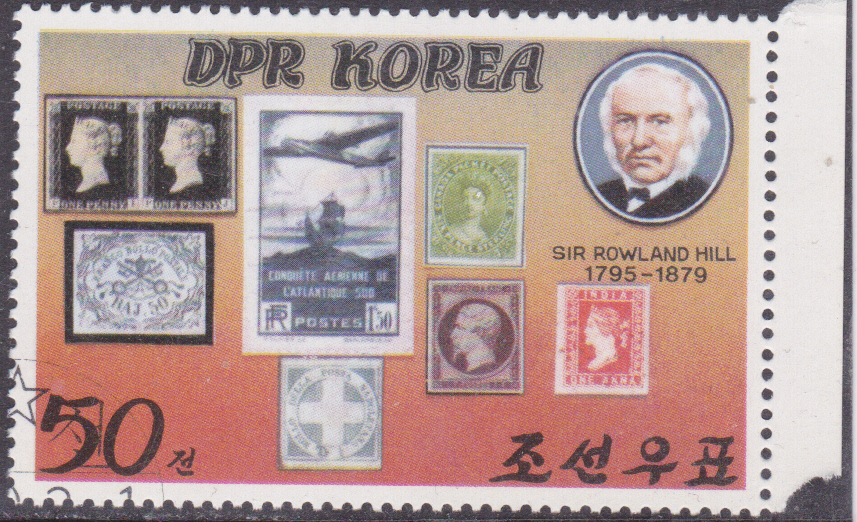 Eine Marke zum 100. Todestag von Rowland Hill aus Korea-Nord (MiNr 1973) zeigt Marken Großbritannien MiNr 1, Schweiz MiNr 375 (Specimen), Schweiz MiNr 184, Sowjetunion MiNr 464, Deutsches Reich Halbamtliche Flugmarke MiNr 5, Korea-Nord MiNr 141 und Württemberg (Altdeutschland) MiNr 42.