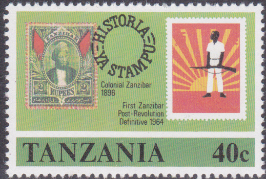 Eine Marke zum 100. Todestag von Rowland Hill aus Tansania (MiNr 141) zeigt die Marken Sansibar MiNr. 36 und 306 (NUR das Motiv ohne Schrift).