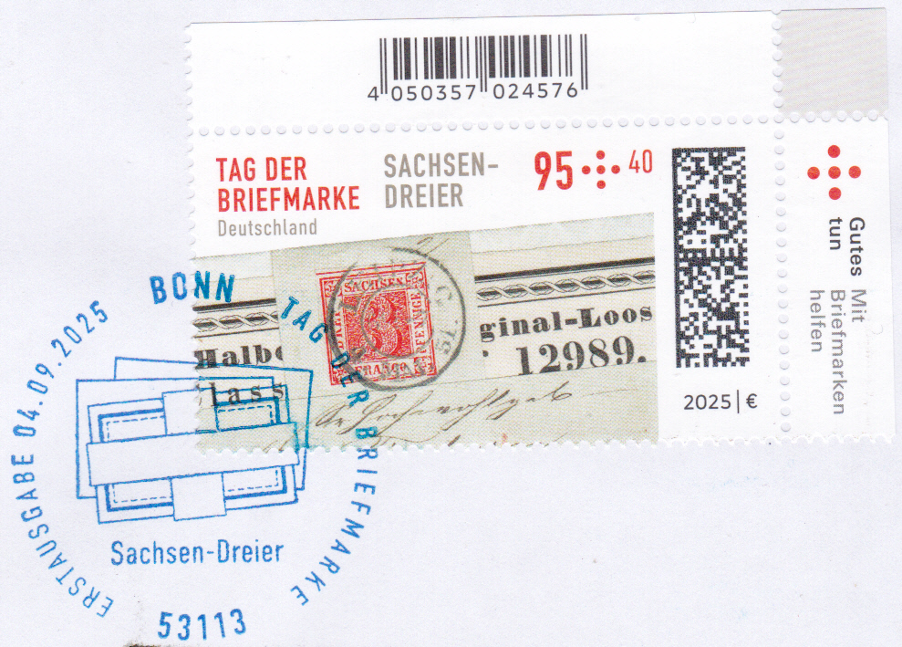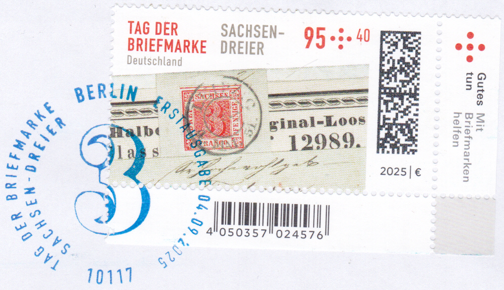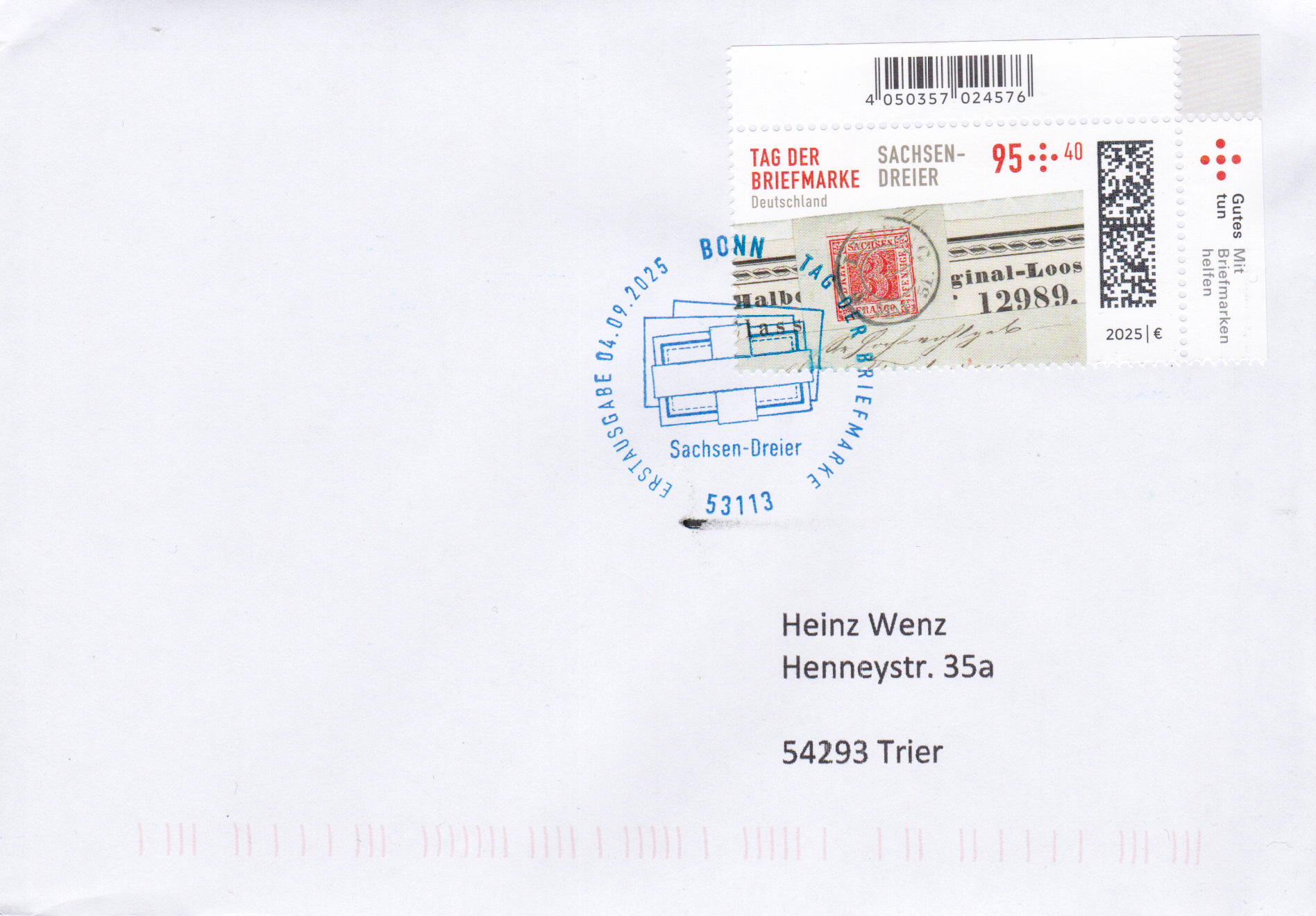 Brief vom Ersttag der Marke "Tag der Briefmarke" (MiNr 3923) mit dem "Sachsen-Dreier" und mit dem Ersttagsonderstempel aus Berlin.