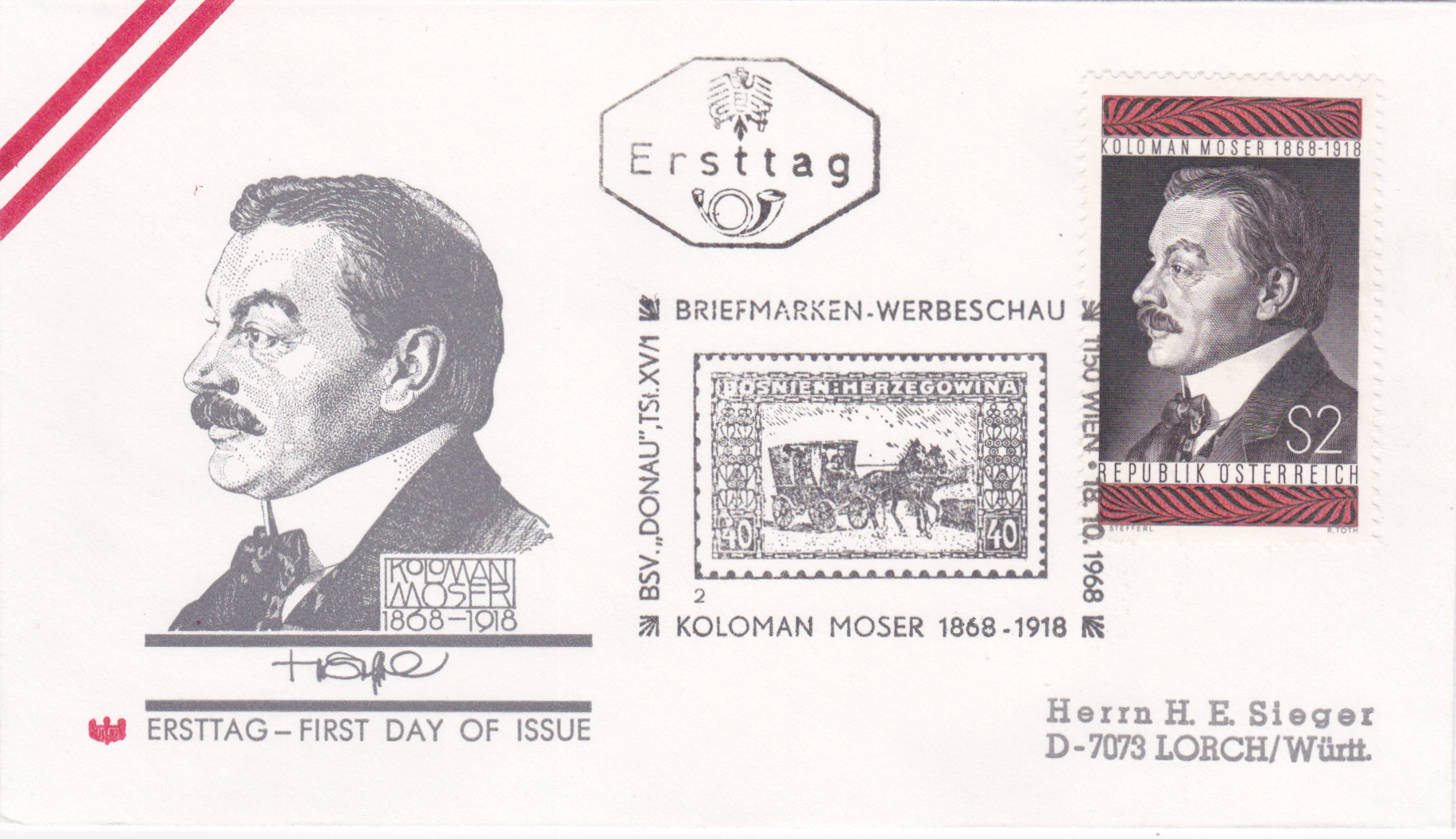 In diesem Sonderstempel aus Wien vom 18.10.1968 am Ausgabetag der Marke zum 50. Todestag von Koloman Moser (1868 - 1918) wird eine Marke aus Bosnien-Herzegowina (MiNr 39) gezeigt, die von Moser entworfen wurde.