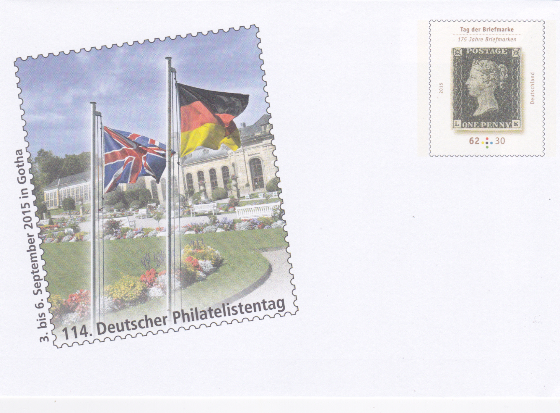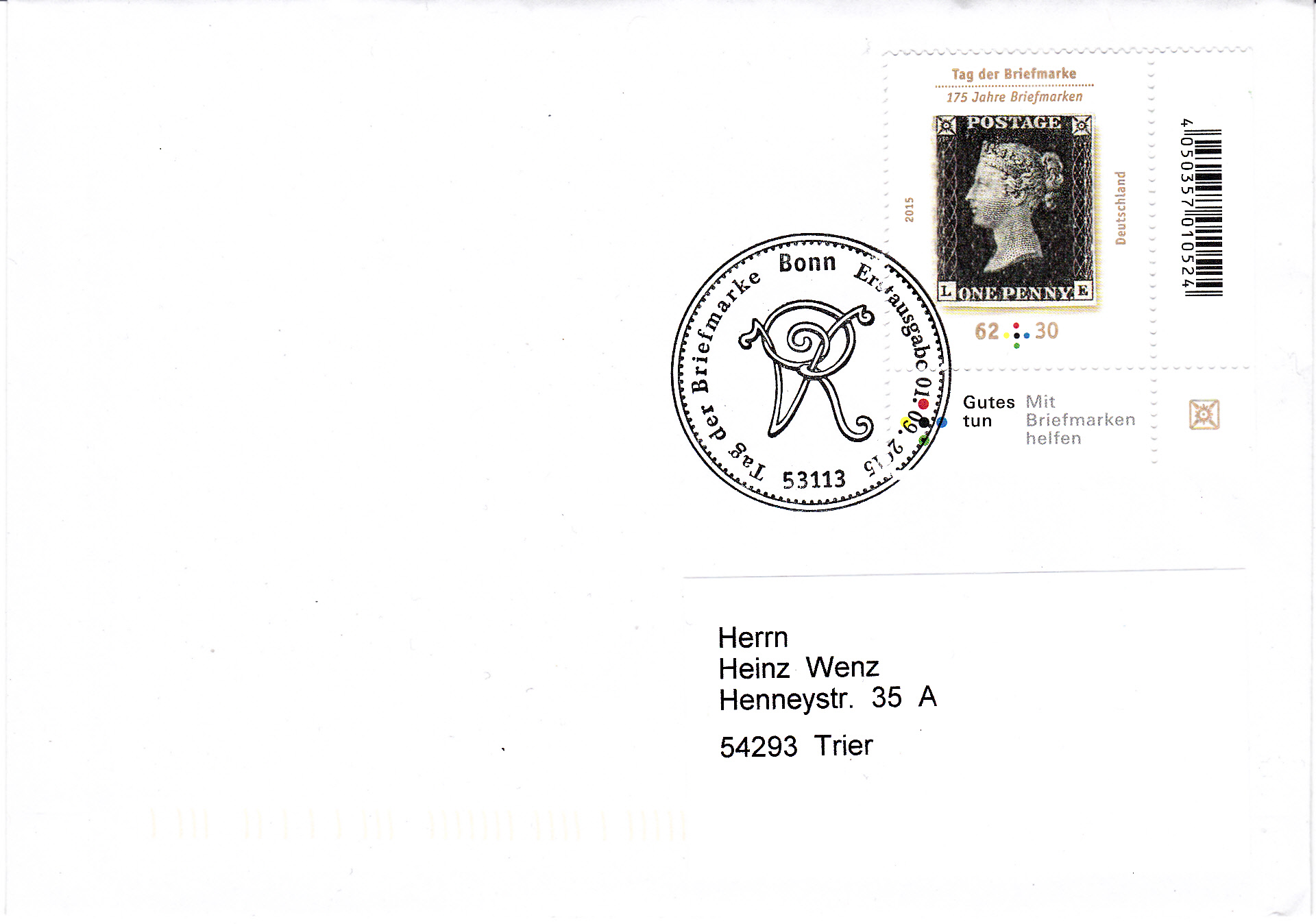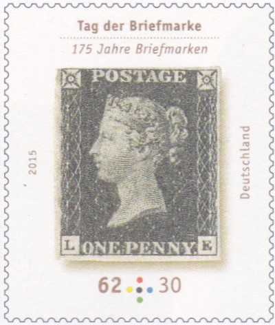 Zum Tag der Briefmarke 2015 erschien am 1.9.2015 bei der Deutschen Post eine Zuschlagsmarke (MiNr 3173) mit der Abbildung der ersten Briefmarke, die vor 175 Jahren (Großbritannien MiNr 1) erschienen ist.
