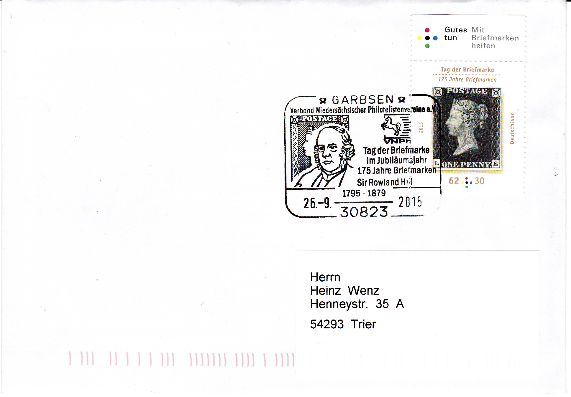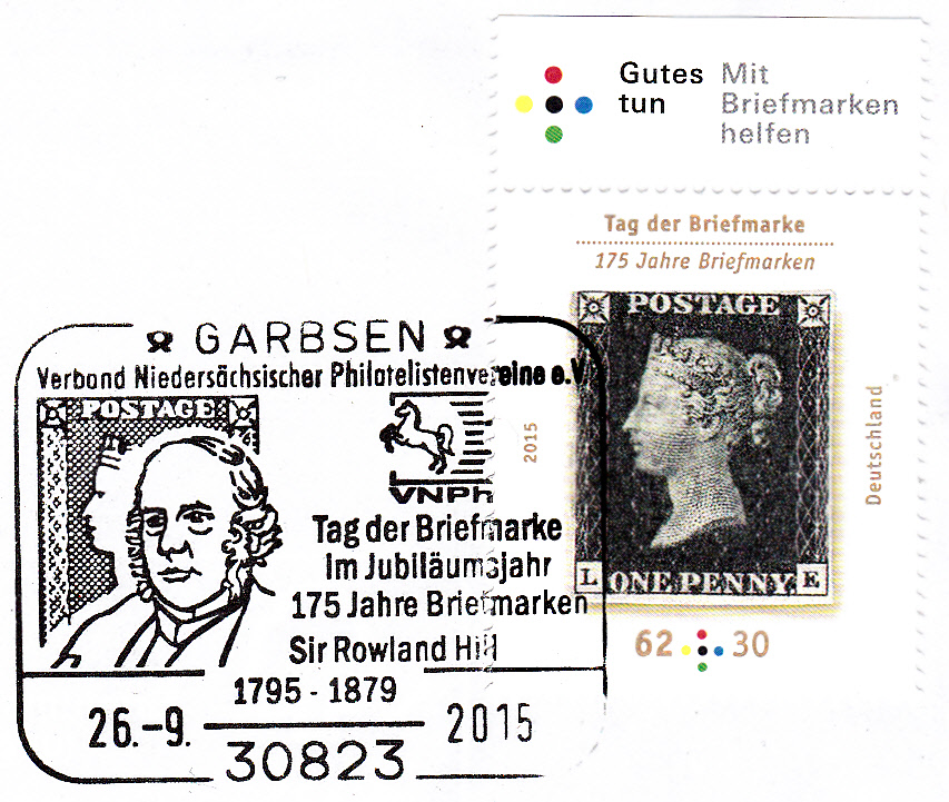 Sonderstempel aus Garbsen vom 26.9.2015 zum Tag der Briefmarke 2015. Im Stempelbild werden ein Porträt von Sir Rowland Hill, die erste Briefmarke, die "One Penny black", und das Verbandsemblem des Verbandes Niedersächsischer Philatelistenvereine e.V. gezeigt.
