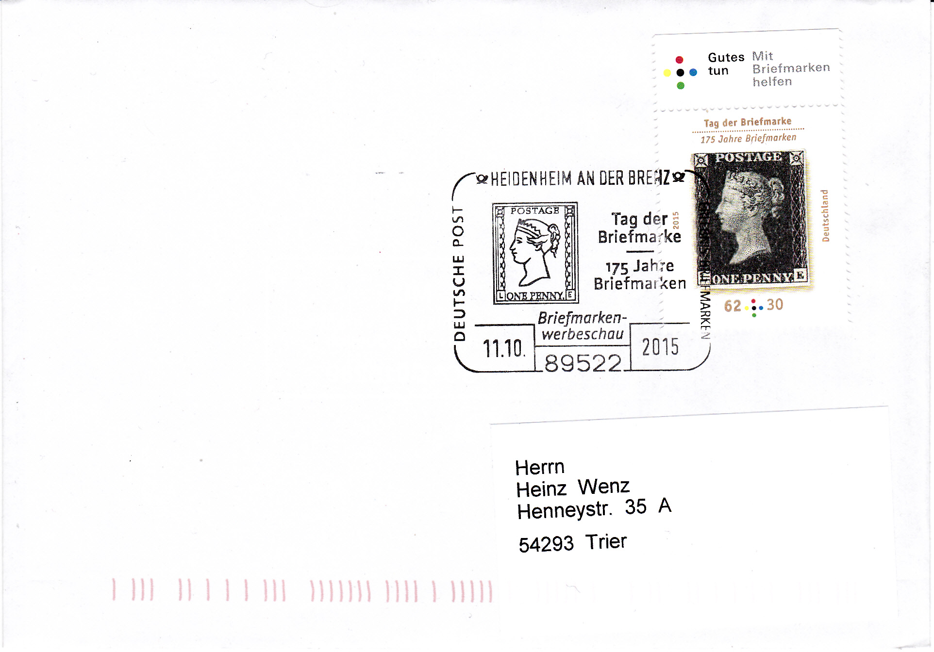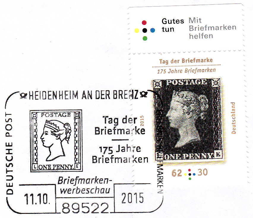 Sonderstempel vom 11.10.2015 aus 89522 Heidenheim an der Brenz zum Tag der Briefmarke 2015 mit der Abbildung der ersten Briefmarke, der "Black Penny".