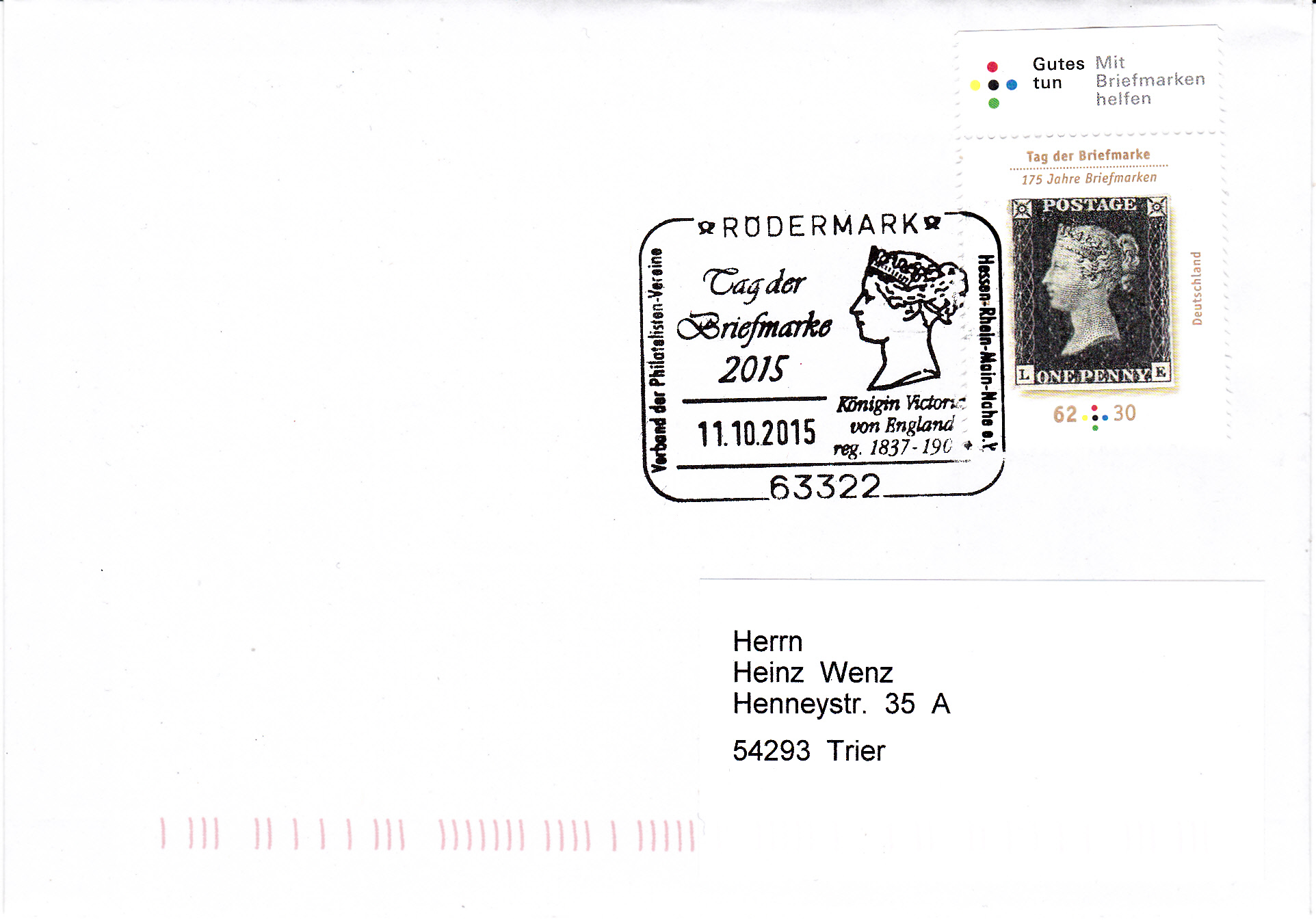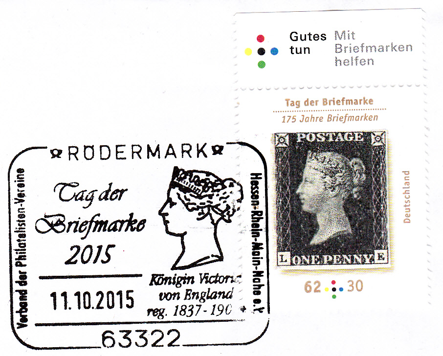 Sonderstempel vom 11.10.2015 aus 63322 Rödermark zum Tag der Briefmarke 2015. Im Stempelbild wird ein Porträt der Königin Victoria gezeigt, das auch als Markenmotiv der ersten Briefmarke diente.