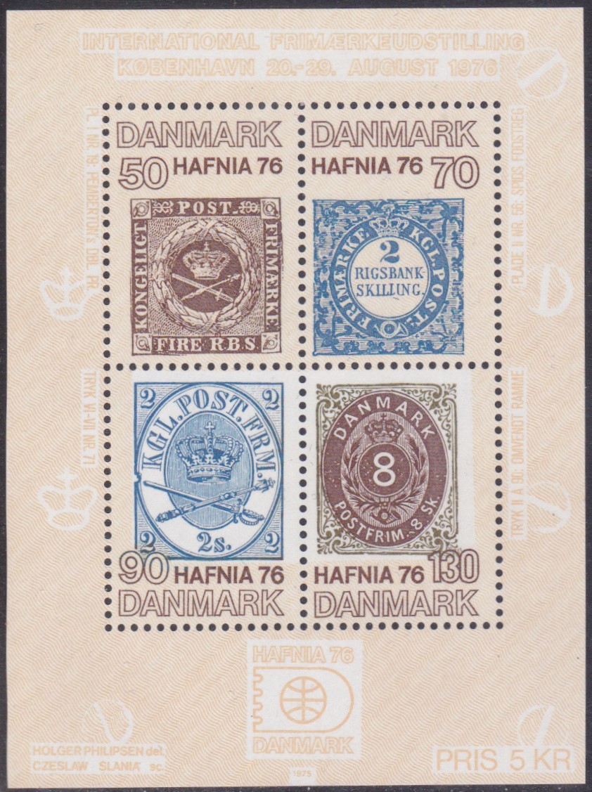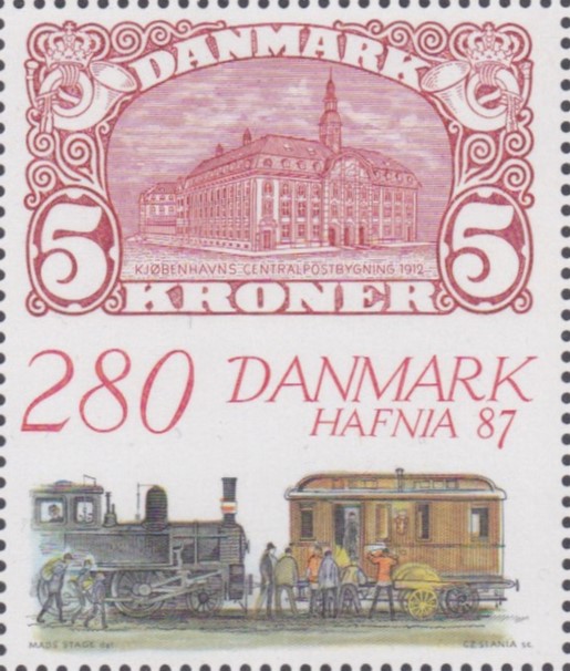 Zur Internationalen Briefmarkenausstellung HAFNIA ’87 in Kopenhagen ist diese Marke (MiNr 900) mit der Marke Dänemark MiNr. 66 im oberen Teil der Marke und einer Lokomotive mit Bahnpostwagen im unteren Teil.