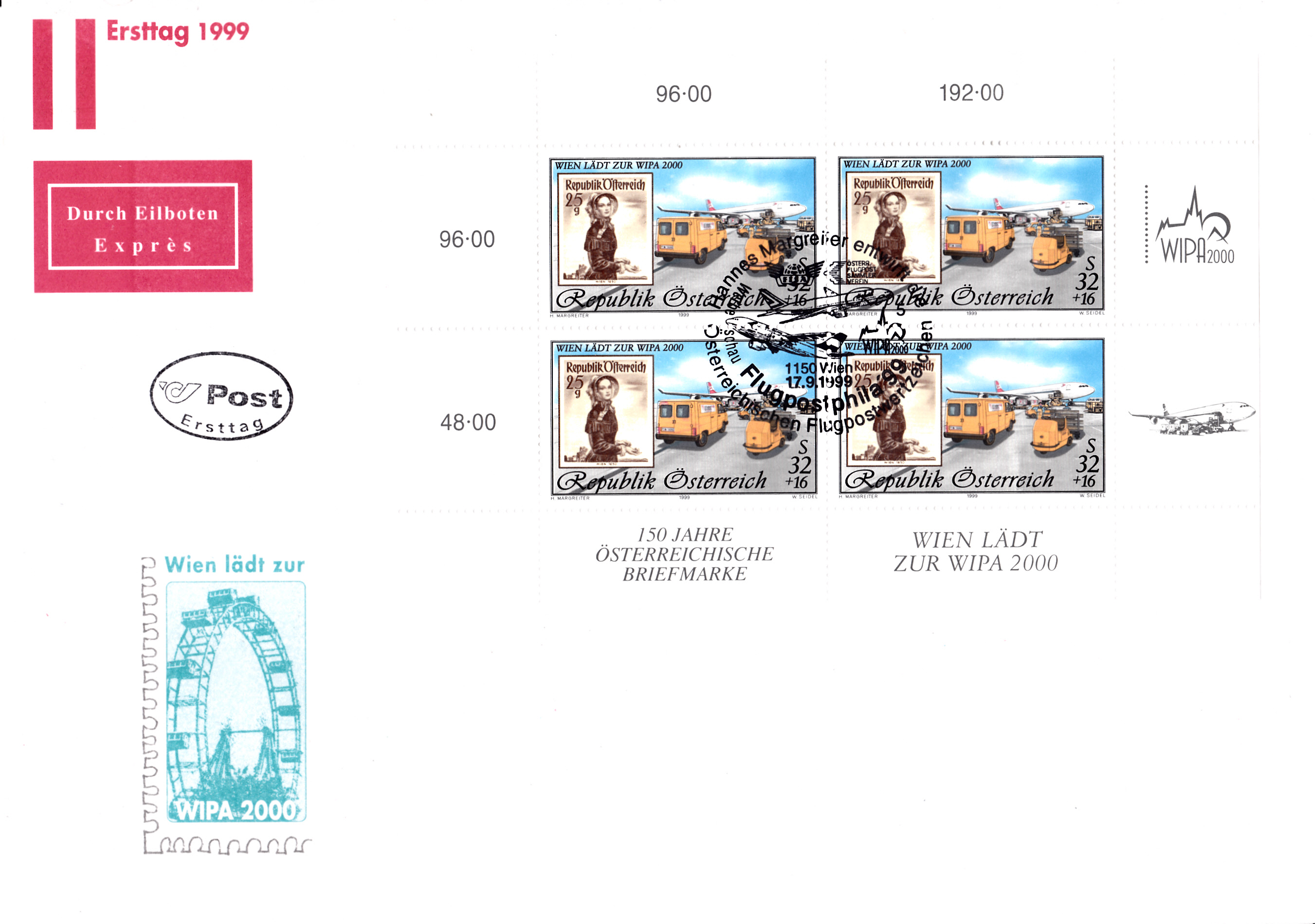 FDC mit einem Kleinbogen der Marke zur Internationalen Briefmarkenausstellung WIPA 2000 in Wien mit der Jahreszahl "1999" (MiNr 2292 I) und einem passenden Sonderstempel aus Wien.