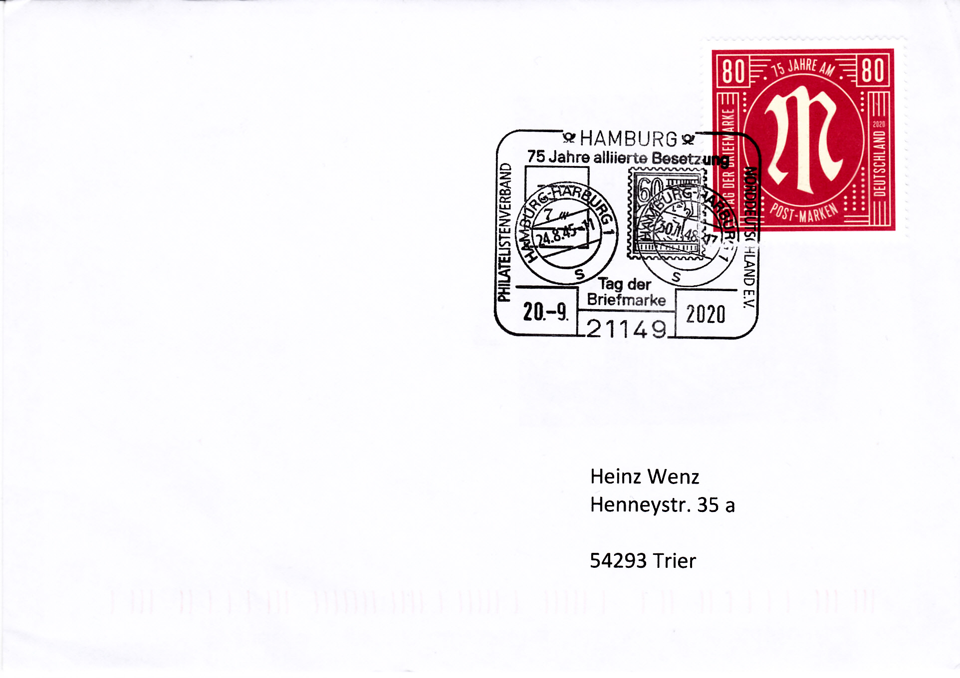Im Sonderstempel des Philatelistenverbandes Norddeutschland aus Hamburg vom 20.9.2020 zum Tag der Briefmarke 2020 ist eine Marke zu 60Pf (MiNr 960) mit dem Motiv "Arbeiter" der II. Kontrollratsausgabe der Alliierten Besatzung zu erkennen.