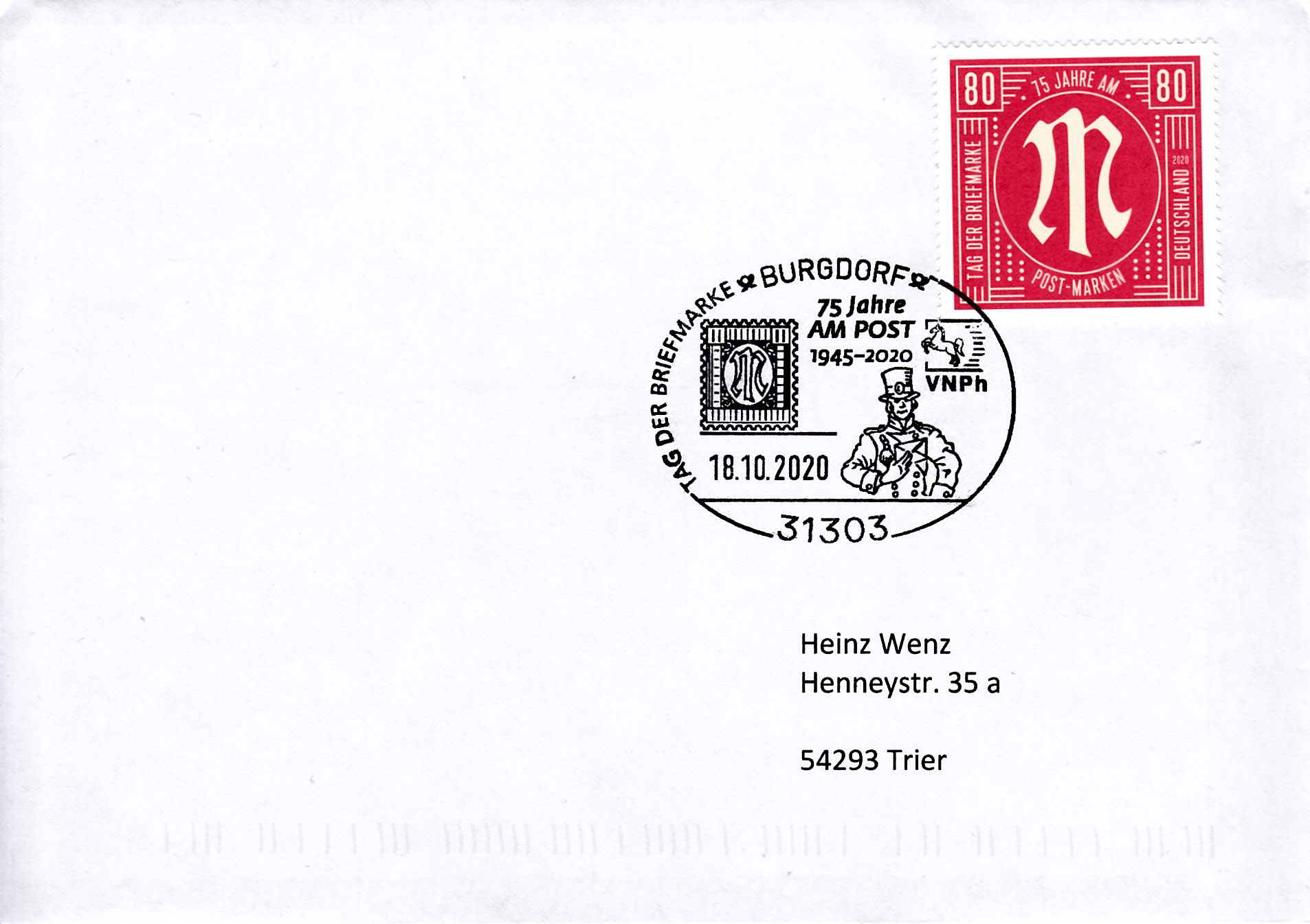In Burgdorf wurde am 18.10.2020 der Sonderstempel zum Tag der Briefmarke des Verbandes Niedersächsischer Philatelistenvereine e.V. eingesetzt. Er zeigt eine "Marke" im Muster der AM-Post.