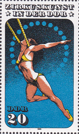 Diese Marke aus der DDR (MiNr 2984) zeigt eine Artistin bei der Luftakrobatik am Schwungtrapez.