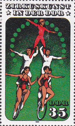 Hier zeige ich eine Marke aus der DDR (MiNr 2985) mit einer Artistengruppe auf dem Einrad.