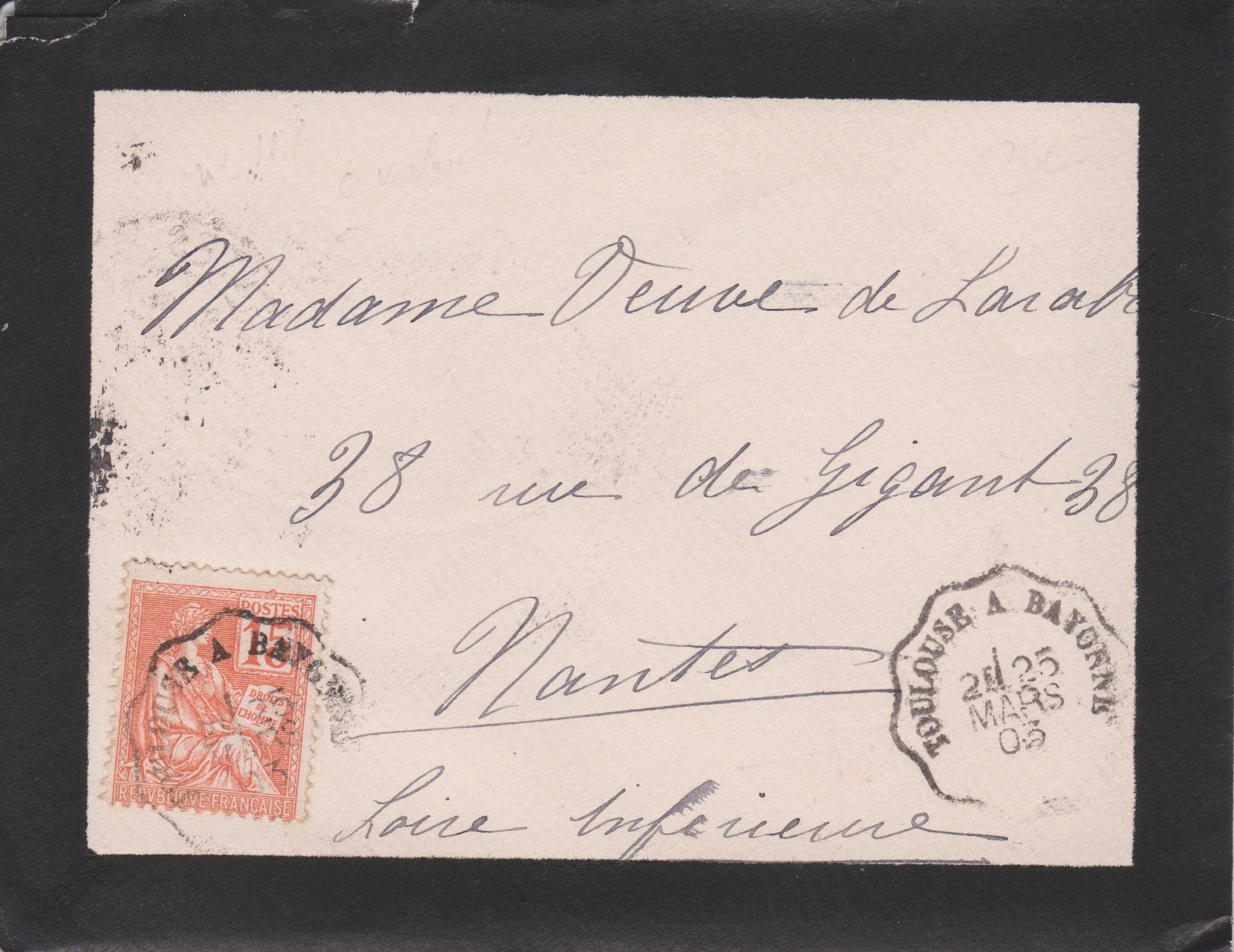 Trauerbrief aus Frankreich, adressiert nach "Nantes", aufgegeben am 25.03.1903 in der Eisenbahn auf der Bahnstrecke "TOULOUSE A BAYONN":