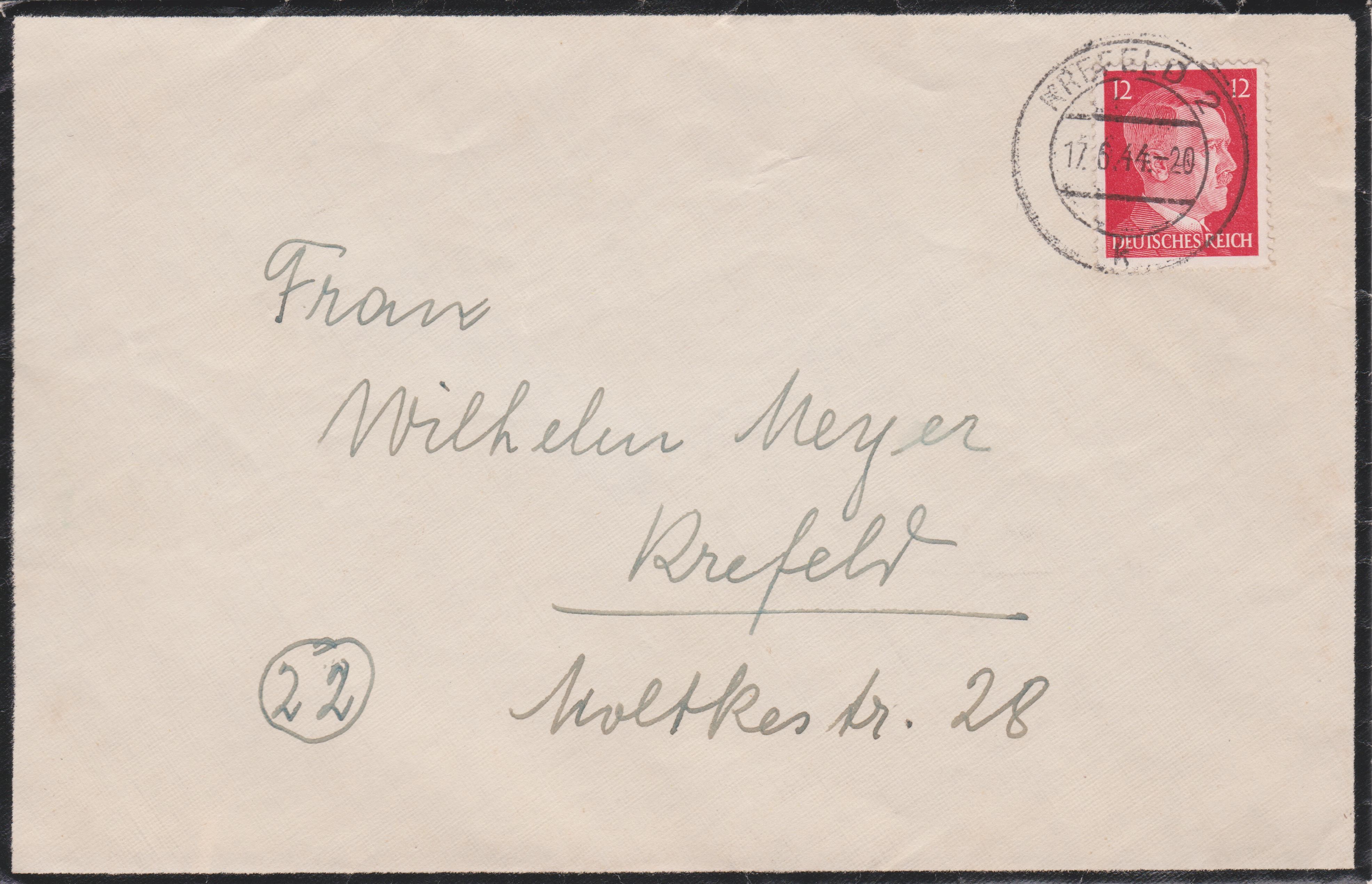 Einzelfrankatur 12 Pf Dauerserie Adolf Hitler am 17.06.1944 auf Trauerbrief von KREFELD 2 nach "22 Krefeld":