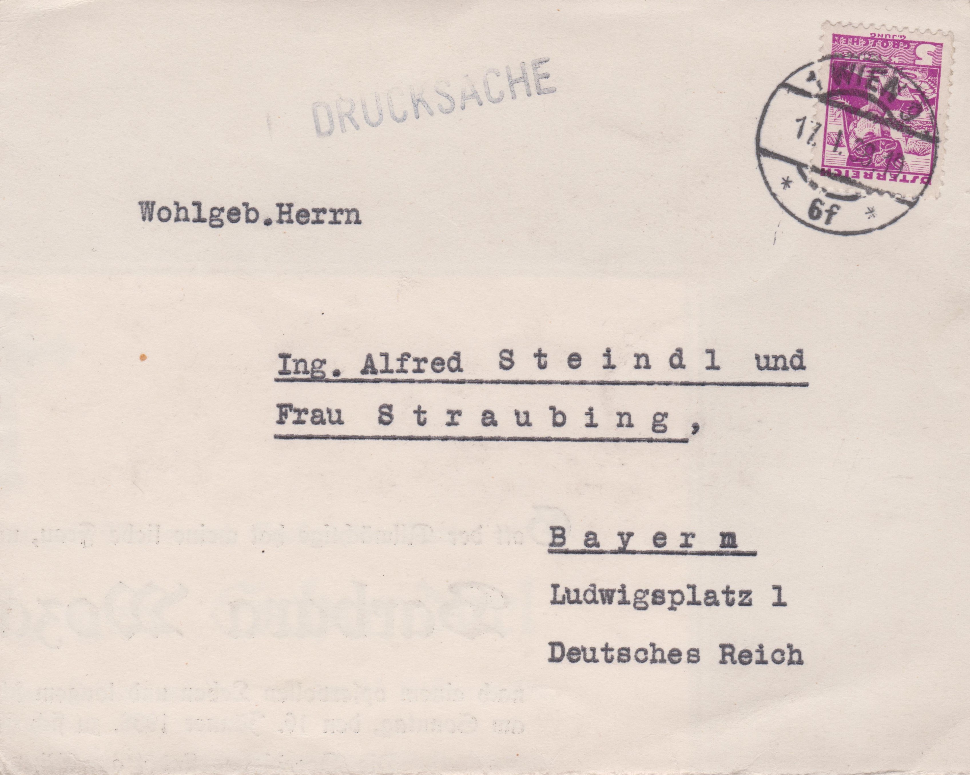 Drucksache mit Einzelfrankatur Österreich 5 GROSCHEN, adressiert nach "Bayern Ludwigsplatz 1":